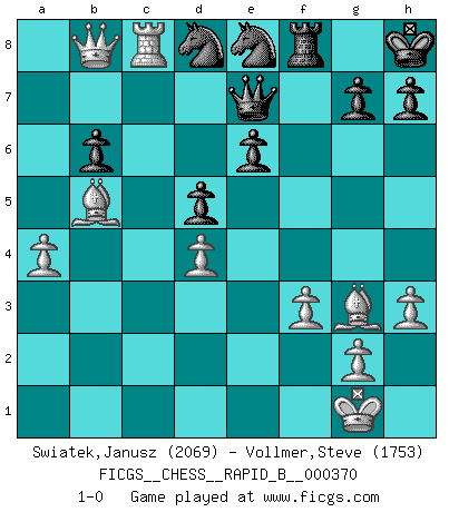 Last move : 1-0 2021 December 5 11:30:36 [Event "FICGS__CHESS__RAPID_B__000370"] [Site "FICGS"] [Date "2021.11.02"] [Round "1"] [White "Swiatek,Janusz"] [Black "Vollmer,Steve"] [Result "1-0"] [WhiteElo "2069"] [BlackElo "1753"] 1.e4 e5 2.Nf3 Nf6 3.Nxe5 d6 4.Nf3 Nxe4 5.d4 Be7 6.Bd3 Nf6 7.O-O O-O 8.Re1 Bg4 9.h3 Be6 10.c4 d5 11.Ng5 Qd7 12.Nd2 Bb4 13.Nxe6 fxe6 14.a3 Bxd2 15.Bxd2 Nc6 16.Bc3 Rae8 17.Qb3 Nd8 18.Bb4 Rf7 19.Rad1 b6 20.c5 c6 21.cxb6 axb6 22.a4 Qa7 23.Qc2 Rc7 24.Bd6 Rc8 25.b4 Qd7 26.Be5 Ra8 27.Rc1 Re7 28.b5 cxb5 29.Bxb5 Qb7 30.Bd6 Rf7 31.f3 Qa7 32.Qe2 Kh8 33.Rc2 Nb7 34.Bg3 Nd8 35.Rec1 Qe7 36.Rc8 Rxc8 37.Rxc8 Rf8 38.Qe5 Ne8 39.Qb8 1-0 Petrov : Classical attack Kingside Castling by player White (move 7) Kingside Castling by player Black (move 7) Player White won this chess game. Follow this game move after move (download)Chess is a part of culture and if a culture is declining then Chess too will decline. (Mikhail Botvinnik) Ich würde mich als ganz normalen Jungen bezeichnen [Im Alter von 12]. (Sergej Karjakin) Para mi, el Ajedrez es la vida y cada partida es como una nueva vida. Todo jugador de Ajedrez suele vivir muchas vidas durante su vida. (Eduard Gufeld) La vie est comme un jeu d'échecs : nous esquissons un plan, mais celui-ci est tributaire de ce que daignent faire l'adversaire aux échecs et le destin dans la vie. (Arthur Schopenhauer) No, I am still playing. (Anatoly Karpov)