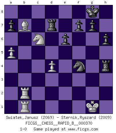 Last move : 1-0 2021 December 11 14:17:35 [Event "FICGS__CHESS__RAPID_B__000370"] [Site "FICGS"] [Date "2021.11.02"] [Round "1"] [White "Swiatek,Janusz"] [Black "Sternik,Ryszard"] [Result "1-0"] [WhiteElo "2069"] [BlackElo "2009"] 1.e4 d5 2.exd5 Qxd5 3.Nc3 Qa5 4.d4 Nf6 5.Nf3 c6 6.Bd3 Bf5 7.b4 Qxb4 8.Bxf5 Qxc3+ 9.Bd2 Qc4 10.Bc8 Nbd7 11.Bxb7 Rb8 12.Rb1 e6 13.Qe2 Qxc2 14.O-O Bd6 15.Qa6 O-O 16.Rfc1 Qf5 17.Rb3 Nd5 18.Rxc6 Bf4 19.g3 Bxd2 20.Nxd2 Qg4 21.Nf3 Nf4 22.h4 Nf6 23.Rc2 N6h5 24.Rcb2 Nxg3 25.fxg3 Qxg3+ 26.Kh1 Rfd8 27.Qf1 h6 28.Qg1 Qh3+ 29.Rh2 Qf5 30.Qb1 Qxb1+ 31.Rxb1 Rdc8 32.Rhb2 Rc3 33.Ne5 Rh3+ 34.Kg1 Rxh4 35.a4 Rd8 36.Nc6 Rd7 37.a5 1-0 Scandinavian (centre counter) defense Kingside Castling by player White (move 14) Kingside Castling by player Black (move 15) Player White won this chess game. Follow this game move after move (download)The blunders are all there on the board, waiting to be made. (Savielly Tartakover) Intelligenz läßt sich nicht am Weg, sondern nur am Ergebnis feststellen. (Garry Kasparov) Una clavada es mas poderosa que una espada. (Fred Reinfeld) Les pièces de l'échiquier étaient impitoyables. Elles le retenaient, elles l'absorbaient. Il y avait de l'horreur en cela, mais aussi une harmonie unique. Car, qu'y a-t-il dans le monde, à part les échecs ? (V. Nabokov) Philosophers use a language that is already deformed as though by shoes that are too tight. (Ludwig Wittgenstein)