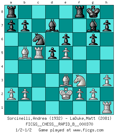 Last move : 1/2-1/2 2021 November 20 20:5:21 [Event "FICGS__CHESS__RAPID_B__000370"] [Site "FICGS"] [Date "2021.11.02"] [Round "1"] [White "Sorcinelli,Andrea"] [Black "LaDuke,Matt"] [Result "1/2-1/2"] [WhiteElo "1932"] [BlackElo "2081"] 1.d4 Nf6 2.Nf3 g6 3.Bg5 Bg7 4.Nbd2 O-O 5.c3 d6 6.e4 c5 7.h3 d5 8.e5 Ne4 9.Be3 Qb6 10.Qb3 cxd4 11.cxd4 Qxb3 12.Nxb3 Nc6 13.Rc1 f6 14.Bb5 Bd7 15.Nc5 Nxc5 16.Rxc5 fxe5 17.dxe5 e6 18.Ke2 1/2-1/2 King's Indian : Torre attack Kingside Castling by player Black (move 4) This chess game ended in a draw. Follow this game move after move (download)The battle for the ultimate truth will never be won. And that's why Chess is so fascinating. (Hans Kmoch) Die jungen Leute sollen verstehen, dass sie noch etwas von mir lernen können und müssen. (Viktor Kortschnoi) ¿Esta Bobby Fischer algo cuerdo?. (Salo Flohr) Dans le domaine de la peinture, de la gravure et de la sculpture, dès la première décennie de notre siècle, les artistes abandonnent la représentation de la partie d'échecs pour se concentrer sur les pièces, sur les échiquiers et sur toutes les variations auxquelles les unes et les autres peuvent donner lieu. On passe en quelque sorte d'un thème social à un thème musical (au sens de la musica médiévale, c'est-à-dire d'une notion qui inclue le rythme, l'harmonie, la construction et la déconstruction, etc.). Graphiquement et picturalement, l'échiquier apparaît comme une structure ouverte, dynamique, d'une richesse infinie, autorisant toutes les combinatoires et débouchant sur des mouvements et des rythmes de nature exponentielle. (Michel Pastoureau) A cynic is a man who knows the price of everything but the value of nothing. (Oscar Wilde)