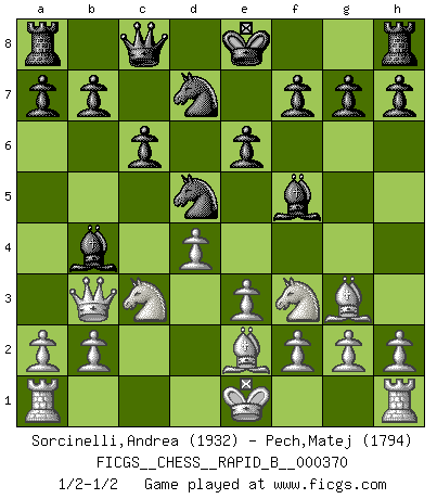 Last move : 1/2-1/2 2021 December 10 9:8:21 [Event "FICGS__CHESS__RAPID_B__000370"] [Site "FICGS"] [Date "2021.11.02"] [Round "1"] [White "Sorcinelli,Andrea"] [Black "Pech,Matej"] [Result "1/2-1/2"] [WhiteElo "1932"] [BlackElo "1794"] 1.d4 d5 2.Bf4 Nf6 3.e3 Bf5 4.c4 e6 5.Nf3 c6 6.Nc3 Nbd7 7.Qb3 Qc8 8.cxd5 Nxd5 9.Bg3 Bb4 10.Be2 1/2-1/2 Queen's pawn, Mason variation This chess game ended in a draw. Follow this game move after move (download)I won't play with you anymore. You have insulted my friend. - When an opponent cursed himself for a blunder. (Miguel Najdorf) Privat ist Kortschnoi kein schlechter Mensch, sehr sympathisch. Aber während des Spiels ist er grausam. Er will dich töten. (Miguel Najdorf) Si tu oponente no puede hacer nada activo, entonces no apures la posición; En vez de eso, dejalo estar sentado ahí, sufriendo y rogandote por un empate. (Jeremy Silman) Comme les marins qui ont mille raisons différentes d'aller en mer, les joueurs d'échecs en ont tout autant avant de s'installer devant une table et jouer... (Vincent Bertignac, philosophe) Wisdom begins at the end. (Daniel Webster)