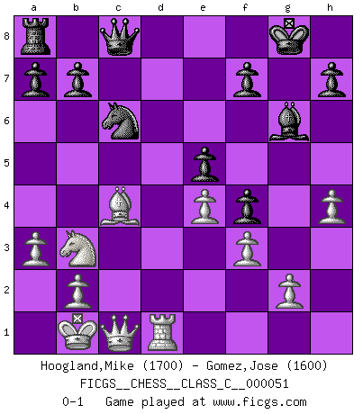 Last move : 0-1 2008 January 12 23:7:22 [Event "FICGS__CHESS__CLASS_C__000051"] [Site "FICGS"] [Date "2007.07.22"] [Round "1"] [White "Hoogland,Mike"] [Black "Gomez,Jose"] [Result "0-1"] [WhiteElo "1700"] [BlackElo "1600"] 1.d4 d5 2.c4 e6 3.Nc3 Nf6 4.Nf3 Be7 5.Bf4 O-O 6.e3 c5 7.dxc5 Bxc5 8.Qc2 Nc6 9.a3 Qa5 10.O-O-O Be7 11.Kb1 Rd8 12.Nd2 e5 13.Bg5 dxc4 14.Bxc4 Bg4 15.f3 Bh5 16.Nb3 Qc7 17.Bxf6 Bxf6 18.Nd5 Qc8 19.Nxf6+ gxf6 20.h4 f5 21.e4 f4 22.Qc1 Rxd1 23.Rxd1 Bg6 0-1 This chess game has been lost on time (started : 2007.07.22 18:40:21) QGD : Classical variation (5.Bf4) Kingside Castling by player Black (move 5) Queenside Castling by player White (move 10) Player Black won this chess game. Follow this game move after move (download)When you absolutely don't know what to do anymore, it is time to panic. (John van der Wiel) Man wirke der falschen Auffassung entgegen, als ob jeder Zug Unmittelbares zu leisten habe; auch Werte- und Ruhezüge haben ihre Existenzberechtigung. (Aaron Nimzowitsch) El Ajedrez es parte de la cultura, y si una cultura esta en decadencia, entonces también el Ajedrez declinará. (Mikhail Botvinnik) Je ne crois pas en la psychologie, je crois aux bons coups. (Robert Fischer) No, I am still playing. (Anatoly Karpov)