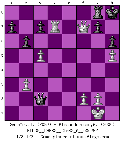 Last move : 1/2-1/2 2021 November 21 22:28:58 [Event "FICGS__CHESS__CLASS_A__000252"] [Site "FICGS"] [Date "2021.11.07"] [Round "1"] [White "Swiatek,Janusz"] [Black "Alexandersson,Anders"] [Result "1/2-1/2"] [WhiteElo "2057"] [BlackElo "2000"] 1.e4 e5 2.Nf3 Nc6 3.Bb5 Nf6 4.O-O Nxe4 5.Re1 Nd6 6.Nxe5 Be7 7.Bf1 Nxe5 8.Rxe5 O-O 9.d4 Ne8 10.d5 Bc5 11.Re1 d6 12.Nc3 Bf5 13.Bd3 Qf6 14.Be3 Qg6 15.h3 h6 16.Bxf5 Qxf5 17.Bxc5 dxc5 18.Ne4 Nf6 19.Nxc5 b6 20.Na6 Nxd5 21.c4 Nf4 22.Qf3 Rac8 23.h4 Rfd8 24.Nb4 Qf6 25.Nc6 Rd3 26.Qe4 Kh8 27.Rad1 Rxd1 28.Rxd1 Ne2+ 29.Qxe2 Qxc6 30.Qg4 Re8 31.b3 Qf6 32.h5 Qb2 33.Qf3 Qxa2 34.Qxf7 Rg8 35.c5 Qc2 36.Rd7 1/2-1/2 Ruy Lopez : Berlin defense, Open variation Kingside Castling by player White (move 4) Kingside Castling by player Black (move 8) This chess game ended in a draw. Follow this game move after move (download)Chess mastery essentially consists of analyzing Chess positions accurately. (Mikhail Botvinnik) Ich erzeugte keinen Neid, da mich die Schachspieler als Musiker und die Musiker als Schachspieler betrachteten. (Mark Taimanov) Nunca antes ha habido un jugador de Ajedrez con tal conocimiento a fondo de las complejidades del juego y una inmensa voluntad absolutamente indomable de ganar. Yo pienso que Fischer es el jugador mas grande que jamás haya existido. (Lisa Lane) J'apprécie les joueurs d'est-indienne, c'est grâce à eux que je nourris ma famille depuis tant d'années. (Petrosian) He who defends everything defends nothing. (Frederick the Great)