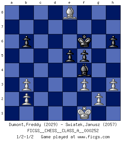 Last move : 1/2-1/2 2022 April 18 12:22:34 [Event "FICGS__CHESS__CLASS_A__000252"] [Site "FICGS"] [Date "2021.11.07"] [Round "1"] [White "Dumont,Freddy"] [Black "Swiatek,Janusz"] [Result "1/2-1/2"] [WhiteElo "2029"] [BlackElo "2057"] 1.e4 c5 2.Nf3 Nc6 3.d4 cxd4 4.Nxd4 Nf6 5.Nc3 d6 6.Nb3 g6 7.f3 Bg7 8.Be3 Be6 9.Qd2 d5 10.exd5 Nxd5 11.Nxd5 Qxd5 12.Qxd5 Bxd5 13.O-O-O O-O-O 14.Rd2 Rd6 15.Be2 Rhd8 16.Bf4 e5 17.Be3 b6 18.Rhd1 Bf8 19.Bg5 R8d7 20.Ba6+ Kc7 21.Bb5 Bg7 22.a4 f5 23.a5 Bf8 24.axb6+ axb6 25.h3 Bxb3 26.Rxd6 Rxd6 27.Rxd6 Kxd6 28.cxb3 Nb4 29.Kd2 Bg7 30.Be8 Ke6 31.Bd8 Nd5 32.Bc6 Bh6+ 33.Ke2 Nf4+ 34.Kf1 Kd6 35.Be8 Nd5 36.Bf7 Be3 37.Bg8 h6 38.Bh7 Nf4 39.Bh4 Kd7 40.Bg3 Ke7 41.Bxf4 Bxf4 42.Bxg6 Kf6 43.Be8 1/2-1/2 Sicilian defense Queenside Castling by player White (move 13) Queenside Castling by player Black (move 13) This chess game ended in a draw. Follow this game move after move (download)It is not enough to be a good player... you must also play well. (Siegbert Tarrasch) Ich trinke, ich rauche, ich spiele, ich liebe Frauen aber Fernschach ist ein Laster, das ich nicht habe. (Mikhail Nekhemyevich Tal) El Ajedrez es una manera fabulosa para que los niños aprendan a autovalorarse y a autoestimarse. (Saudin Robovic) Les échecs c'est le défi de l'alpiniste, toujours plus haut, prêt à tout pour monter à l'assaut du Roi ennemi. Les échecs, c'est de la musique en mouvement, un ballet majestueux pour les yeux. C'est de la poésie composée par les fantômes du passé qui au même titre que Rimbaud ou Verlaine méritent notre admiration. Les échecs, c'est de la peinture ou le moindre mouvement modifie le tableau pour en faire un Picasso ou un Van Gogh. Les échecs, c'est tout et rien, c'est la vie et la mort. Jjulie33 sur le forum de France-Echecs. The problem with troubleshooting is that trouble shoots back. (Anonymous)