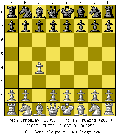 Last move : 1-0 2021 December 19 8:47:9 [Event "FICGS__CHESS__CLASS_A__000252"] [Site "FICGS"] [Date "2021.11.07"] [Round "1"] [White "Pech,Jaroslav"] [Black "Arifin,Raymond"] [Result "1-0"] [WhiteElo "2009"] [BlackElo "2000"] 1.c4 1-0 This chess game has been lost on time (started : 2021.11.07 16:39:1) English Opening Player White won this chess game. Follow this game move after move (download)When in doubt... play Chess ! (Tevis) Zu meiner Zeit war ein 20 jähriger ein junger Spieler, heute ist er ein Veteran. (Garry Kasparov) El Ajedrez, como cualquier otra actividad creativa, puede existir solo a través de méritos combinados de aquellos que tienen talento creativo y de aquellos que tienen la habilidad de organizar un trabajo creativo. (Mikhail Botvinnik) On croit qu'il y a plus de mauvais joueurs que de bons joueurs, c'est faux : Il y a autant de joueurs qui gagnent que de joueurs qui perdent. (Philippe Geluck) Creativity is allowing yourself to make mistakes. Art is knowing which ones to keep. (Scott Adams)
