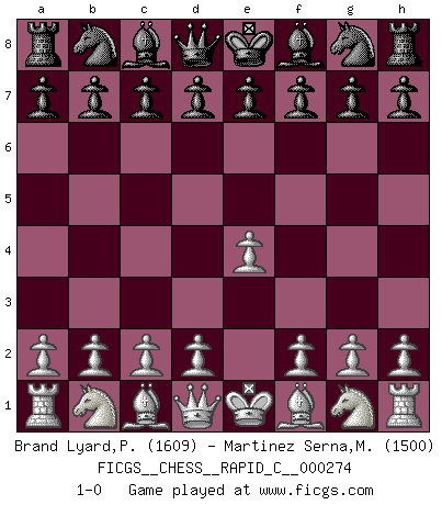 Last move : 1-0 2021 December 8 15:40:0 [Event "FICGS__CHESS__RAPID_C__000274"] [Site "FICGS"] [Date "2021.11.07"] [Round "1"] [White "Brand Lyard,Paul"] [Black "Martinez Serna,Miguel Angel"] [Result "1-0"] [WhiteElo "1609"] [BlackElo "1500"] 1.e4 1-0 This chess game has been lost on time (started : 2021.11.07 23:1:17) King's pawn Opening Player White won this chess game. Follow this game move after move (download)Chess is a terrible game. If you have no center, your opponent has a freer position. If you do have a center, then you really have something to worry about ! (Siegbert Tarrasch) Die meiste Zeit treffe ich auf Gegner, die meine Enkel sein könnten. Ich bin da, um ihnen zu zeigen, dass sie von mir noch einiges lernen können. (Viktor Kortschnoi) Vive, pierde y aprende al observar a tu oponente como ganar. (Amber Steenbock) D'abord les bases : Jouez et étudiez, puis étudiez et jouez, ensuite jouez et étudiez, puis étudiez et jouez. Deuxièmement : Donnez toujours le meilleur de vous-même ! (Ken Smith) Don't be irreplaceable, if you can't be replaced, you can't be promoted. (Dan Rotaru)