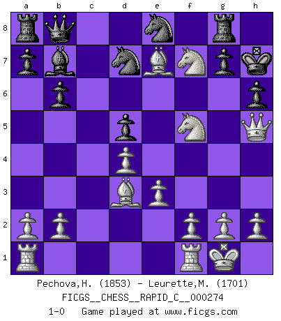 Last move : 1-0 2021 December 30 9:55:38 [Event "FICGS__CHESS__RAPID_C__000274"] [Site "FICGS"] [Date "2021.11.07"] [Round "1"] [White "Pechova,Hana"] [Black "Leurette,Marc-Antoine"] [Result "1-0"] [WhiteElo "1853"] [BlackElo "1701"] 1.d4 d5 2.c4 e6 3.Nc3 Nf6 4.Bg5 Be7 5.Nf3 b6 6.cxd5 exd5 7.e3 c6 8.Bd3 h6 9.Bf4 Bd6 10.Ne5 O-O 11.O-O Nbd7 12.Nxc6 Qe8 13.Bxd6 Bb7 14.Ne7+ Kh8 15.Nb5 Qd8 16.Nf5 Rg8 17.Be7 Qb8 18.Nbd6 Ne8 19.Nxf7+ Kh7 20.Qh5 1-0 QGD : 4.Bg5 Be7 Kingside Castling by player Black (move 10) Kingside Castling by player White (move 11) Player White won this chess game. Follow this game move after move (download)Man is a frivolous, a specious creature, and like a Chess player, cares more for the process of attaining his goal than for the goal itself. (Dostoyevsky) Es ist wirklich schade, dass so viele Schachspieler nicht auf ihr Äußeres achten! (Alexandra Kosteniuk) Ser exitoso en el Ajedrez te permite descubrir tu propia personalidad. Eso es lo que deseo para los niños de mi clase. (Saudin Robovic) On a dit que l'homme se distingue de l'animal par le fait qu'il achète plus de livres qu'il ne peut en lire. Je voudrais suggérer qu'inclure à la liste des livres quelques livres d'échecs rendrait la distinction manifeste. (Edward Lasker) Follow your passion, and success will follow you. (Arthur Buddhold)