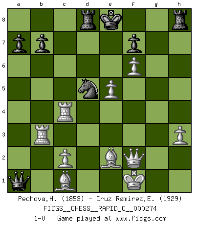 Last move : 1-0 2022 February 19 1:45:58 [Event "FICGS__CHESS__RAPID_C__000274"] [Site "FICGS"] [Date "2021.11.07"] [Round "1"] [White "Pechova,Hana"] [Black "Cruz Ramirez,Eliecer"] [Result "1-0"] [WhiteElo "1853"] [BlackElo "1929"] 1.e4 e6 2.d4 d5 3.Nc3 Bb4 4.e5 c5 5.a3 Bxc3+ 6.bxc3 Ne7 7.Qg4 Qc7 8.Qxg7 Rg8 9.Qxh7 cxd4 10.Ne2 Nbc6 11.f4 dxc3 12.Qd3 d4 13.Nxd4 Nxd4 14.Qxd4 Bd7 15.Rg1 Rh8 16.h3 Nf5 17.Qf2 Bc6 18.g4 Nh4 19.Rg3 Qa5 20.Be2 Qd5 21.Kf1 Rd8 22.a4 Ng6 23.Qh2 Qc5 24.Ra3 Qb4 25.Qf2 Bxa4 26.Rgxc3 Bc6 27.Rab3 Qa4 28.f5 exf5 29.gxf5 Ne7 30.f6 Nd5 31.Rxc6 Qa1 32.Rc4 1-0 French : Winawer, Advance, poisoned pawn variation Player White won this chess game. Follow this game move after move (download)Fischer wanted to give the Russians a taste of their own medicine. (Larry Evans) Konzentriere dich auf materielle Gewinne. Nimm, was dir dein Gegner gibt, ausser es gibt einen guten Grund der dagegenspricht. (Robert James Fischer) En posiciones complicadas, Bobby Fischer pocas veces tuvo que temer de cualquiera. (Paul Keres) Les échecs sont utiles à l'exercice de la faculté de penser et à celle de l'imagination. Car nous devons posséder une méthode élaborée pour atteindre des buts partout où nous devons conduire notre raison. (Leibnitz) Big Chess is a place for big hallucinations. (Thibault de Vassal)