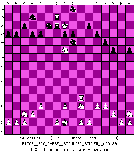 Last move : 1-0 2021 December 15 21:32:17 [Event "FICGS__BIG_CHESS__STANDARD_SILVER__000039"] [Site "FICGS"] [Date "2021.11.13"] [Round "2"] [White "de Vassal,Thibault"] [Black "Brand Lyard,Paul"] [Result "1-0"] [WhiteElo "2173"] [BlackElo "1529"] 1.j2-k4 g15-g14 2.h2-g4 j15-k13 3.h1-o7 o15-o14 4.e2-e4 d15-d13 5.f1-b5 h14-h13 6.m2-m4 m15-m14 7.o7-p8 n15-n13 8.p8-j8 c15-c14 9.b5-k13 c16-o5 10.k1-l3 m14-m13 11.n2-n4 o5-p4 12.o2-o3 p4-q5 13.k13-b5 o16-c5 14.j8-j5 c5-f2 15.j5-f2 l16-p12 16.f2-f15 e16-d16 17.f15-g14 h16-g15 18.g14-e14 d16-d14 19.e14-e5 p12-g4 20.h3-g4 g15-g4 21.o1-k5 m16-m14 22.d2-d3 m14-l14 23.b1-c3 d14-f14 24.b5-l14 k15-l14 25.e5-g5 g4-g5 26.c1-g5 f16-n9 27.g5-h4 n9-h4 28.j3-h4 p15-p13 29.e1-f1 f14-f1 30.a1-f1 g16-f14 31.f1-f8 b16-d15 32.k5-n8 q5-n8 33.f8-n8 p16-n15 34.j1-h2 a16-g16 35.g1-f3 g16-g4 36.n8-o8 o14-o13 37.l1-o4 k16-m15 38.o4-k8 q15-q14 39.k8-g5 q16-k16 40.l3-m5 g4-g5 41.f3-g5 k16-k4 42.m5-k4 o13-o12 43.m1-f1 m15-l13 44.p1-q3 n15-o13 45.f1-f7 e15-e13 46.q1-j1 j14-j13 47.o8-l8 l13-j12 48.l8-l14 j16-k15 49.l14-o14 l15-l14 50.o14-o13 n13-n12 51.o13-o14 q14-q13 52.o14-o13 q13-q12 53.o13-p13 o12-o11 54.p13-p15 k15-j14 55.j1-j5 a15-a13 56.j5-k5 h15-k14 57.g5-h7 b15-b14 58.h7-j9 b14-b13 59.j9-h11 q12-q11 60.f7-g7 j14-h14 61.p15-g15 k14-j16 62.g7-g14 1-0 Follow this game move after move (download)The most important feature of the Chess position is the activity of the pieces. This is absolutely fundamental in all phases of the game: Opening, Middlegame and especially Endgame. The primary constraint on a piece's activity is the Pawn structure. (Michael Stean) Pläne sind die Träume des Verständigen. (Ernst Freiherr von Feuchtersleben) El estómago es una parte esencial del maestro de Ajedrez. (Bent Larsen) D'abord les bases : Jouez et étudiez, puis étudiez et jouez, ensuite jouez et étudiez, puis étudiez et jouez. Deuxièmement : Donnez toujours le meilleur de vous-même ! (Ken Smith) Methinks King Thibault should dub Marius Zubac a knight of the square board... I mean table, henceforth addressing him as Sir Marius, and bestow on him a suitable land from the kingdom of FICGS & marry him off to a worthy, fair maiden, lest he slice our heads with his mighty sword in his wrath. (Dinesh De Silva)