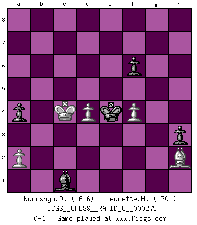 Last move : 0-1 2022 January 22 15:36:55 [Event "FICGS__CHESS__RAPID_C__000275"] [Site "FICGS"] [Date "2021.11.15"] [Round "1"] [White "Nurcahyo,Dery"] [Black "Leurette,Marc-Antoine"] [Result "0-1"] [WhiteElo "1616"] [BlackElo "1701"] 1.e4 e5 2.Nc3 Nf6 3.Bc4 Bb4 4.Nd5 Nxd5 5.Bxd5 c6 6.Bb3 d5 7.c3 Ba5 8.exd5 cxd5 9.d3 d4 10.Qf3 Qe7 11.Ne2 Nc6 12.O-O O-O 13.Bd5 Bd7 14.Bd2 Rac8 15.Rad1 Bb6 16.Rfe1 Bc7 17.cxd4 Qd6 18.Bxc6 Bxc6 19.dxe5 Bxf3 20.exd6 Bxe2 21.Rxe2 Bxd6 22.Bc3 b6 23.g3 f6 24.Re6 Rcd8 25.d4 Kf7 26.Rde1 Rfe8 27.Rxe8 Rxe8 28.Rxe8 Kxe8 29.Kg2 Ke7 30.h4 h5 31.Kf3 Ke6 32.Ke4 f5+ 33.Kd3 f4 34.gxf4 Kd5 35.Ke3 Be7 36.f5 Bxh4 37.Kf3 a5 38.Ke3 a4 39.f3 b5 40.Kd3 Bg5 41.Be1 Bf6 42.Bf2 h4 43.b3 h3 44.Bg1 Be7 45.f4 Bd6 46.Bh2 Ba3 47.Kc3 Ke4 48.f6 gxf6 49.bxa4 bxa4 50.Kc4 Bc1 0-1 Vienna game Kingside Castling by player White (move 12) Kingside Castling by player Black (move 12) 10 pieces endgame at move 49 : White KBPPP , Black KBPPP WHITE : King + 1 Bishop 3 Pawns BLACK : King + 1 Bishop 3 Pawns Player Black won this chess game. Follow this game move after move (download)Chess, like love, like music, has the power to make people happy. (Siegbert Tarrasch) Man braucht nicht immer den besten Zug zu spielen: Ein Zug muß aktiv, unternehmungslustig, korrekt und schön sein. (David Bronstein) Fischer no está bajo la obligación de nadie. (Joseph Platz) J'ai toujours senti une vague pitié pour l'homme qui ne connaît rien aux échecs, tout comme j'en aurais pour un homme ignorant de l'amour. Les Echecs, comme la musique ou comme l'amour, ont le pouvoir de rendre heureux. (Siegbert Tarrasch) Life is painting a picture, not doing a sum. (Oliver Wendell Holmes, Jr.)