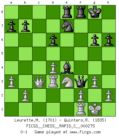 Last move : 0-1 2021 December 1 10:22:4 [Event "FICGS__CHESS__RAPID_C__000275"] [Site "FICGS"] [Date "2021.11.15"] [Round "1"] [White "Leurette,Marc-Antoine"] [Black "Quintero,Raul"] [Result "0-1"] [WhiteElo "1701"] [BlackElo "1835"] 1.e4 c5 2.Nf3 d6 3.d3 Nc6 4.Nc3 Nf6 5.Be2 g6 6.Bg5 Bg7 7.Qd2 h6 8.Bxf6 Bxf6 9.O-O Bg7 10.a3 e6 11.Rab1 O-O 12.d4 cxd4 13.Nd1 e5 14.c3 f5 15.exf5 Bxf5 16.Bd3 e4 17.Nxd4 Bxd4 18.cxd4 exd3 19.Ne3 Qg5 20.Rbd1 Be4 21.Qc3 Rae8 22.Rd2 Ne7 23.g3 Qh5 24.Rxd3 Qf3 0-1 Sicilian Kingside Castling by player White (move 9) Kingside Castling by player Black (move 11) Player Black won this chess game. Follow this game move after move (download)Chess is as much a mystery as women. (Purdy) Drei Punkte vor allen anderen ist wie einer, der im weißen Anzug posiert, während der Rest in Müllsäcke gekleidet dasteht. (Viktor Kortschnoi) Siempre es mejor sacrificar los hombres de tu oponente. (Savielly Tartakower) Les échecs sont un jeu par leur forme, un art par leur essence et une science par sa difficulté d'acquisition. Ils peuvent vous procurer autant de plaisir qu'un bon livre ou une belle musique, mais vous n'aurez une réelle joie que si vous arrivez à bien jouer. (Tigran Petrosian) A woman without a man is like a fish without a bicycle. (Gloria Steinem)