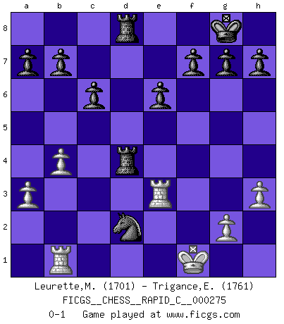 Last move : 0-1 2021 November 23 15:4:9 [Event "FICGS__CHESS__RAPID_C__000275"] [Site "FICGS"] [Date "2021.11.15"] [Round "1"] [White "Leurette,Marc-Antoine"] [Black "Trigance,Emile"] [Result "0-1"] [WhiteElo "1701"] [BlackElo "1761"] 1.e4 c6 2.d4 d5 3.Nc3 dxe4 4.Nxe4 Bf5 5.Ng3 Bg6 6.Nf3 Nd7 7.Be3 e6 8.Bd3 Bxd3 9.Qxd3 Qc7 10.O-O Ngf6 11.c4 Be7 12.Rfe1 Rd8 13.c5 Nxc5 14.Qc2 Ncd7 15.a3 O-O 16.b4 Nb6 17.h3 Nbd5 18.Rab1 Nxe3 19.fxe3 Qxg3 20.Qf2 Qxf2+ 21.Kxf2 Ne4+ 22.Kg1 Rd5 23.Kh2 Bd6+ 24.Kg1 Bg3 25.Rec1 Bf2+ 26.Kf1 Bxe3 27.Rd1 Rfd8 28.Rd3 Bxd4 29.Nxd4 Rxd4 30.Re3 Nd2+ 0-1 Caro-Kann : Classical variation Kingside Castling by player White (move 10) Kingside Castling by player Black (move 15) Player Black won this chess game. Follow this game move after move (download)As one by one I mowed them down, my superiority soon became apparent. (Jose Capablanca) Wenn ein Kopf und ein Buch zusammenstoßen und es klingt hohl, ist es denn allemal im Buche? (Georg Christoph Lichtenberg) El Ajedrez es tan inspirador que yo no creo que un buen jugador sea capaz de tener un pensamiento malo durante una partida. (Wilhelm Steinitz) Toutes choses étant égales, c'est la conviction qui gagne. Alliée à une volonté de vaincre, elle sert de détonateur, suscite des idées, disperse les doutes et aide à penser clairement. (Robert Fischer) Looking at the proliferation of personal web pages on the Net, it looks like very soon everyone on Earth will have 15 megabytes of fame. (M.G. Sriram)
