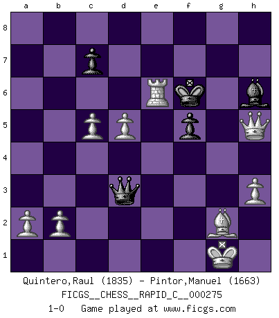 Last move : 1-0 2021 December 13 19:44:40 [Event "FICGS__CHESS__RAPID_C__000275"] [Site "FICGS"] [Date "2021.11.15"] [Round "1"] [White "Quintero,Raul"] [Black "Pintor,Manuel"] [Result "1-0"] [WhiteElo "1835"] [BlackElo "1663"] 1.Nf3 Nc6 2.d4 d5 3.g3 Bg4 4.Bg2 Nf6 5.O-O e6 6.c3 Bd6 7.Nbd2 O-O 8.Re1 Ne4 9.Nxe4 dxe4 10.Ng5 f5 11.Nxe6 Qf6 12.Nxf8 Rxf8 13.Qb3+ Kh8 14.f3 exf3 15.exf3 Bh5 16.Qxb7 Ne7 17.f4 a5 18.Be3 h6 19.d5 a4 20.Bd4 Qf7 21.Re6 Be2 22.Rxe2 Qh5 23.Rae1 Ng6 24.Re6 Rg8 25.c4 Nxf4 26.gxf4 Bxf4 27.h3 Qg5 28.Qa7 Qg3 29.Qxa4 Kh7 30.c5 h5 31.Re8 Qd3 32.Rxg8 Kxg8 33.Qe8+ Kh7 34.Qxh5+ Bh6 35.Bxg7 Kxg7 36.Re7+ Kf6 37.Re6+ 1-0 Reti Opening Kingside Castling by player White (move 5) Kingside Castling by player Black (move 7) Player White won this chess game. Follow this game move after move (download)Chess, like love, is infectious at any age. (Flohr) Mein erstes Ziel war nicht, die Partie zu gewinnen, sondern eine Figur zu opfern. -- der junge (Wilhelm Steinitz) Solo los afeminados hacen el Enroque. (Rob Sillars) On croit qu'il y a plus de mauvais joueurs que de bons joueurs, c'est faux : Il y a autant de joueurs qui gagnent que de joueurs qui perdent. (Philippe Geluck) If everyone is thinking alike, then somebody isn't thinking. (US General George S. Patton)