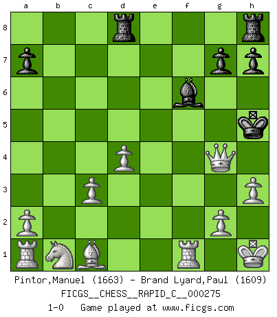Last move : 1-0 2021 November 25 12:40:50 [Event "FICGS__CHESS__RAPID_C__000275"] [Site "FICGS"] [Date "2021.11.15"] [Round "1"] [White "Pintor,Manuel"] [Black "Brand Lyard,Paul"] [Result "1-0"] [WhiteElo "1663"] [BlackElo "1609"] 1.e4 e5 2.f4 Bc5 3.Nf3 exf4 4.d4 Bb4+ 5.c3 Bd6 6.e5 Be7 7.Bxf4 d5 8.exd6 cxd6 9.Bc4 Bg4 10.O-O Bxf3 11.Qxf3 Qb6 12.Kh1 Qxb2 13.Bxf7+ Kxf7 14.Bc1 Bf6 15.Bxb2 Nh6 16.Qxb7+ Nd7 17.Qxd7+ Kg6 18.Qxd6 Ng4 19.h3 Rad8 20.Qg3 Kg5 21.Bc1+ Kh5 22.Qxg4+ 1-0 KGD : Classical variation Kingside Castling by player White (move 10) Player White won this chess game. Follow this game move after move (download)When I asked Fischer why he had not played a certain move in our game, he replied: 'Well, you laughed when I wrote it down !' (Mikhail Tal) Alles was ich jemals tun will ist Schach spielen. (Robert James Fischer) Cuando no sepas que mover, espera por una idea que se le venga a la la cabeza de tu oponente. Tenlo por seguro de que esa idea estará incorrecta. (Siegbert Tarrasch) La menace est plus forte que l'exécution. (Aaron Nimzovitch) If I had no sense of humor, I would long ago have committed suicide. (Mahatma Gandhi)