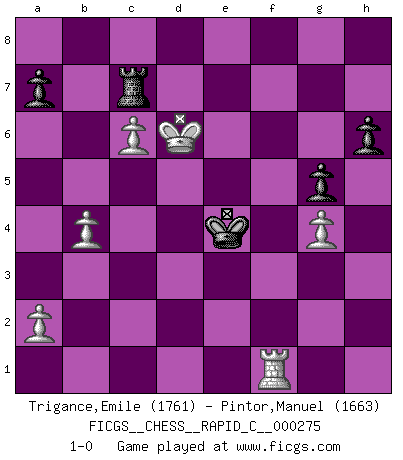 Last move : 1-0 2021 December 5 8:9:1 [Event "FICGS__CHESS__RAPID_C__000275"] [Site "FICGS"] [Date "2021.11.15"] [Round "1"] [White "Trigance,Emile"] [Black "Pintor,Manuel"] [Result "1-0"] [WhiteElo "1761"] [BlackElo "1663"] 1.Nf3 Nc6 2.d4 d5 3.Bf4 Bf5 4.e3 Nf6 5.h3 e6 6.Bb5 Bd6 7.Bxc6+ bxc6 8.Ne5 O-O 9.Nxc6 Qd7 10.Ne5 Qa4 11.b3 Qa6 12.Qc1 Ne4 13.Qb2 Qa5+ 14.c3 f6 15.Nc6 Qa6 16.Bxd6 Nxd6 17.Ne7+ Kh8 18.Nxf5 Nxf5 19.Qc2 Rac8 20.Qe2 Qxe2+ 21.Kxe2 c5 22.Rc1 cxd4 23.g4 Nh4 24.exd4 f5 25.Nd2 fxg4 26.hxg4 Rf4 27.f3 Rcf8 28.Rf1 e5 29.dxe5 Re8 30.Rf2 Rxe5+ 31.Kd3 g5 32.Rc1 Re8 33.c4 d4 34.c5 Re3+ 35.Kc2 Nxf3 36.Nxf3 R4xf3 37.Rxf3 Rxf3 38.Kd1 Rf7 39.c6 Rc7 40.Kd2 Kg7 41.Kd3 Kf6 42.Kxd4 Ke6 43.Kc5 Ke5 44.Rf1 h6 45.b4 Ke4 46.Kd6 1-0 Reti Opening Kingside Castling by player Black (move 8) Player White won this chess game. Follow this game move after move (download)If I win a tournament, I win it by myself. I do the playing. Nobody helps me. (Bobby Fischer) Ich würde die 30 stärksten Spieler der USA im Simultanspiel besiegen. (José Raúl Capablanca) Los libros de Ajedrez deben de usarse igual como usamos los anteojos: para mejorar la vista, aunque algunos jugadores los quieren usar como si ellos les otorgaran la vision. (José Raúl Capablanca) A ce moment-là, je menaçais de comprendre la position ! (Clément L'Heureux) The only difference between a tax man and a taxidermist is that the taxidermist leaves the skin. (Mark Twain)