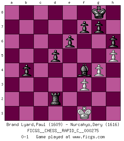 Last move : 0-1 2022 January 12 5:19:25 [Event "FICGS__CHESS__RAPID_C__000275"] [Site "FICGS"] [Date "2021.11.15"] [Round "1"] [White "Brand Lyard,Paul"] [Black "Nurcahyo,Dery"] [Result "0-1"] [WhiteElo "1609"] [BlackElo "1616"] 1.d4 c6 2.e4 d6 3.Bc4 e6 4.Nf3 Nf6 5.Bg5 Be7 6.Bxf6 Bxf6 7.O-O Nd7 8.Re1 Nb6 9.b3 d5 10.exd5 cxd5 11.Bb5+ Bd7 12.Bxd7+ Nxd7 13.Nc3 a6 14.a4 Rc8 15.Qd3 Qa5 16.g3 Rxc3 17.Qe2 O-O 18.Qd2 Qc7 19.Rac1 h6 20.Re3 Rc6 21.c3 Rc8 22.Kg2 Nf8 23.h4 Ng6 24.h5 Ne7 25.b4 Nf5 26.Ne1 Nxe3+ 27.Qxe3 Rxc3 28.Rxc3 Qxc3 29.Qxc3 Rxc3 30.b5 axb5 31.axb5 Bxd4 32.Nf3 Bf6 33.b6 Rb3 34.g4 Rxb6 35.Ne1 Rb4 36.Kg3 Re4 37.Ng2 b5 38.f3 Rd4 39.Ne3 Bg5 40.Nc2 Bf4+ 41.Kf2 Rd2+ 42.Kf1 Rxc2 43.Ke1 Rd2 44.Kf1 b4 0-1 Queen's pawn Kingside Castling by player White (move 7) Kingside Castling by player Black (move 17) Player Black won this chess game. Follow this game move after move (download)In complicated positions, Bobby Fischer hardly had to be afraid of anybody. (Paul Keres) Schach ist das Spiel, das die Verrückten gesund hält. (Albert Einstein) Mi estilo es algo parecido entre un poco de Tal y Petrosian. (Reshevsky) Les écrivains ont utilisé les échecs pour analyser les côtés extrêmes de la nature humaine. Dans ce cadre, les échecs offrent un champ d'expérimentation idéal. Mais on pourrait faire la même chose avec la peinture. Et là, en vous référant à Van Gogh, vous ne tirerez pas de conclusion définitive sur les peintres. (Gary Kasparov) Games, world of games... There's always an opponent, and there's always a victim. (Revolver, movie)