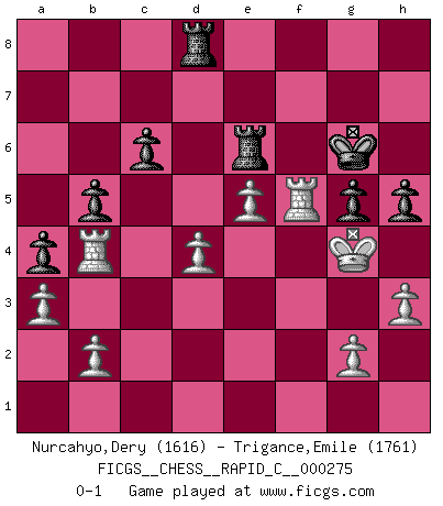 Last move : 0-1 2022 January 30 9:44:25 [Event "FICGS__CHESS__RAPID_C__000275"] [Site "FICGS"] [Date "2021.11.15"] [Round "1"] [White "Nurcahyo,Dery"] [Black "Trigance,Emile"] [Result "0-1"] [WhiteElo "1616"] [BlackElo "1761"] 1.c4 e5 2.Nc3 Nc6 3.d3 Nf6 4.Nf3 d5 5.cxd5 Nxd5 6.e4 Nb6 7.Be2 Be7 8.Be3 O-O 9.O-O Be6 10.Qd2 f6 11.a3 Nd4 12.Bd1 Qd7 13.Kh1 a5 14.Bxd4 exd4 15.Ne2 Bc5 16.Rc1 Qe7 17.Nexd4 Bxd4 18.Nxd4 c6 19.f4 Rfd8 20.Qc3 a4 21.Be2 Qd7 22.Nf3 Bg4 23.h3 Bxf3 24.Rxf3 Qd4 25.Qc2 Nd7 26.Qc4+ Qxc4 27.Rxc4 Nb6 28.Rb4 Nd7 29.Rg3 b5 30.Bg4 Nf8 31.d4 Re8 32.e5 fxe5 33.fxe5 Ne6 34.Rc3 Rad8 35.Bxe6+ Rxe6 36.Kh2 g6 37.Kg3 Kg7 38.Rf3 g5 39.Rf5 Kg6 40.Kg4 h5+ 0-1 English : Sicilian Reversed Kingside Castling by player Black (move 8) Kingside Castling by player White (move 9) Player Black won this chess game. Follow this game move after move (download)By playing at Chess then, we may learn: First: Foresight... Second: Circumspection... Third: Caution... And lastly, we learn by Chess the habit of not being discouraged by present bad appearances in the state of our affairs, the habit of hoping for a favorable chance, and that of persevering in the secrets of resources. (Benjamin Franklin) Moralische Siege zählen nicht. (Savielly Grigorievitsch Tartakower) Cuando me preguntan: -¿Cual es el secreto que te hace hacer mejores movidas que tus oponentes?, Yo respondo: Me da gusto que me pregunten eso, porque, como veran, hay una simple razón. Yo pienso mis propias movidas y dejo a mi oponente que el piense las suyas. (Alexander Alekhine) Les ravages du H expliquent la différence de niveau entre Tal et Thal [Abergel]. Everybody lies. (Gregory House, House M.D.)