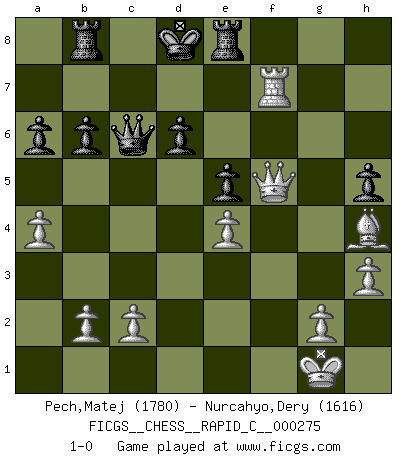 Last move : 1-0 2022 March 8 13:0:58 [Event "FICGS__CHESS__RAPID_C__000275"] [Site "FICGS"] [Date "2021.11.15"] [Round "1"] [White "Pech,Matej"] [Black "Nurcahyo,Dery"] [Result "1-0"] [WhiteElo "1780"] [BlackElo "1616"] 1.e4 e5 2.Bc4 Nf6 3.d3 h6 4.Nf3 d6 5.h3 Nbd7 6.a4 a6 7.Nc3 Nc5 8.Be3 Ne6 9.d4 exd4 10.Nxd4 Nxd4 11.Qxd4 Be6 12.Bxe6 fxe6 13.Rd1 e5 14.Qb4 Qc8 15.f4 Be7 16.fxe5 dxe5 17.Qb3 Bd6 18.O-O b6 19.Nd5 Nxd5 20.Qxd5 Rb8 21.Qf7+ Kd8 22.Qxg7 Re8 23.Rxd6+ cxd6 24.Rf7 Qc6 25.Bf2 h5 26.Qg5+ Kc8 27.Qf5+ Kd8 28.Bh4+ 1-0 Bishop's Opening : Berlin defense Kingside Castling by player White (move 18) Player White won this chess game. Follow this game move after move (download)A chess genius has died; a loss for humanity. (Viktor Kortchnoi, about Bobby Fischer's death) Meine Liebe ist Schach, Schach, Schach. Ich muss jeden Tag Schach spielen, deshalb fühle ich mich so stark. (Miguel Najdorf) Yo creo que el Ajedrez posee una magia que es también una ayuda en la edad avanzada. Una rodilla reumática es olvidada durante una partida de Ajedrez y otros eventos pueden parecer algo sin importancia comparada a una catástrofe en el tablero de Ajedrez. (Vlastimil Hort) Les échecs sont utiles à l'exercice de la faculté de penser et à celle de l'imagination. Car nous devons posséder une méthode élaborée pour atteindre des buts partout où nous devons conduire notre raison. (Leibnitz) The various flowers seem good to different people. (Chinese proverb)