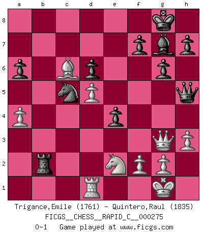 Last move : 0-1 2022 January 12 9:7:47 [Event "FICGS__CHESS__RAPID_C__000275"] [Site "FICGS"] [Date "2021.11.15"] [Round "1"] [White "Trigance,Emile"] [Black "Quintero,Raul"] [Result "0-1"] [WhiteElo "1761"] [BlackElo "1835"] 1.Nf3 Nf6 2.c4 c5 3.d4 cxd4 4.Nxd4 Nc6 5.Nc3 g6 6.e4 d6 7.Be2 Bg7 8.Nb3 O-O 9.O-O Be6 10.Be3 Rc8 11.Nd2 Nd7 12.Nf3 Na5 13.Nd5 Nxc4 14.Bd4 Nxb2 15.Bxb2 Bxb2 16.Rb1 Bxd5 17.exd5 Bf6 18.Rxb7 Rc7 19.Rxc7 Qxc7 20.Qd2 Rc8 21.a4 Nc5 22.Bb5 a6 23.Bc6 Rb8 24.h3 e5 25.Qh6 Bg7 26.Qd2 Qe7 27.Rd1 e4 28.Nd4 Qf6 29.Qe3 Rb2 30.Ne2 Qh4 31.Qg3 Qh5 0-1 Reti Opening Kingside Castling by player Black (move 8) Kingside Castling by player White (move 9) Player Black won this chess game. Follow this game move after move (download)The beauty of a move lies not in its' appearance but in the thought behind it. (Siegbert Tarrasch) Um dein Spiel zu verbessern musst du zuallererst das Endspiel studieren, denn diese kann unabhängig studiert werden. Die Eröffnung und das Mittelspiel müssen immer in Bezug gesetzt werden zum Endspiel. (José Raúl Capablanca) No todos los artistas son jugadores de Ajedrez, pero todos los jugadores de Ajedrez son artistas. (Marcel Duchamp) La tactique est l'élément le plus important du milieu de jeu. (Siegbert Tarrasch) Players are not good because they find tactics, it is about the way to find the positions in which those tactics are hidden. (Luc-Olivier Leclerc)