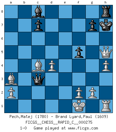 Last move : 1-0 2022 January 21 23:6:17 [Event "FICGS__CHESS__RAPID_C__000275"] [Site "FICGS"] [Date "2021.11.15"] [Round "1"] [White "Pech,Matej"] [Black "Brand Lyard,Paul"] [Result "1-0"] [WhiteElo "1780"] [BlackElo "1609"] 1.d4 d5 2.c4 e6 3.Nc3 dxc4 4.e4 Bb4 5.Bxc4 Bxc3+ 6.bxc3 h5 7.Nf3 Nh6 8.Ba3 Ng4 9.h3 Nf6 10.Ng5 Nxe4 11.Nxe4 f5 12.Nc5 Kf7 13.Qf3 b6 14.Qxa8 bxc5 15.Qxb8 Qd6 16.Qxa7 Qf4 17.Qxc5 Qe4+ 18.Kf1 Kf6 19.Re1 Qc2 20.h4 Qxc3 21.Qe7+ Kg6 22.Rxe6+ Kh7 23.Rh6+ Kxh6 24.Qg5+ Kh7 25.Qxh5+ 1-0 QGD : 3.Nc3 Player White won this chess game. Follow this game move after move (download)A sacrifice is best refuted by accepting it. (Wilhelm Steinitz) Modernes Schach sorgt sich zuviel um Dinge wie Bauernstruktur usw. Vergessen Sie das, Schachmatt beendet das Spiel! (Nigel Short) Al jugar al Ajedrez entonces, podemos aprender: Primero: Previsión... Segundo: Prudencia... Tercero: Cautela... Y al final, aprendemos del Ajedrez el hábito de no ser desanimados por apariencias malas presentes en el estado de nuestros asuntos, el hábito de la esperanza por una oportunidad favorable y la perseveración de los secretos de los recursos. (Benjamin Franklin) Ce qui est bien, c'est d'avoir tout un tas de pièces en prise : l'adversaire ne peut en prendre qu'une à la fois. Cité par Thierry Audin. I have opinions of my own - strong opinions - but I don't always agree with them. (George Bush)