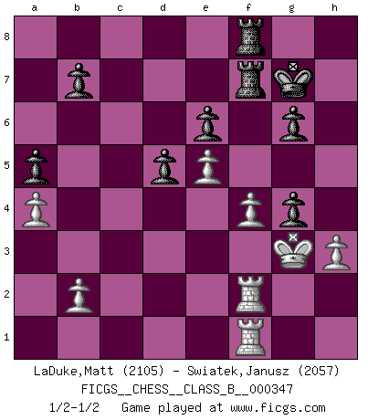 Last move : 1/2-1/2 2021 December 19 15:12:4 [Event "FICGS__CHESS__CLASS_B__000347"] [Site "FICGS"] [Date "2021.11.15"] [Round "1"] [White "LaDuke,Matt"] [Black "Swiatek,Janusz"] [Result "1/2-1/2"] [WhiteElo "2105"] [BlackElo "2057"] 1.e4 e6 2.d4 d5 3.Nc3 Nf6 4.e5 Nfd7 5.f4 c5 6.Nf3 Nc6 7.Be3 a6 8.Ne2 Qb6 9.Qc1 f6 10.c3 Be7 11.exf6 Nxf6 12.dxc5 Bxc5 13.Bxc5 Qxc5 14.Ned4 O-O 15.Bd3 Nxd4 16.cxd4 Qd6 17.Ne5 Bd7 18.Nxd7 Nxd7 19.O-O Nf6 20.Qe3 Ng4 21.Qf3 Nh6 22.h3 Qb6 23.Qf2 Nf5 24.Bxf5 Rxf5 25.Qe3 h5 26.g4 Rf7 27.Rf2 Qd6 28.Raf1 Raf8 29.Kg2 a5 30.Qe5 Qxe5 31.dxe5 g6 32.Kg3 Kg7 33.a4 hxg4 1/2-1/2 French : Steinitz, Boleslavsky variation Kingside Castling by player Black (move 14) Kingside Castling by player White (move 19) This chess game ended in a draw. Follow this game move after move (download)All I want to do, ever, is just play Chess. (Bobby Fischer) Kritik überlasse ich den Spießern. Ich zeige nichts, wofür ich mich schämen muss. (Alexandra Kosteniuk) El Ajedrez expande y enriquece tu mente. (Saudin Robovic) À la honte des hommes, on sait que les lois du jeu sont les seules qui soient partout justes, claires, inviolables et exécutées. Pourquoi l'Indien qui a donné les règles du jeu d'échecs est-il obéi de bon gré dans toute la terre, et que les décrétales des papes, par exemple, sont aujourd'hui un objet d'horreur et de mépris ? C'est que l'inventeur des échecs combina tout avec justesse pour la satisfaction des joueurs, et que les papes, dans leurs décrétales, n'eurent en vue que leur seul avantage. L'Indien voulut exercer également l'esprit des hommes et leur donner du plaisir; les papes ont voulu abrutir l'esprit des hommes. Voltaire (Dictionnaire philosophique / Garnier 1967) Yoga is 99% practice and 1% knowledge. (Sri Krishna Pattabhi Jois)