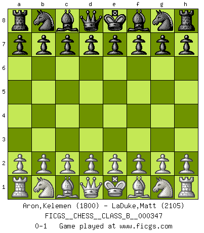 Last move : 0-1 2021 December 25 9:33:37 [Event "FICGS__CHESS__CLASS_B__000347"] [Site "FICGS"] [Date "2021.11.15"] [Round "1"] [White "Aron,Kelemen"] [Black "LaDuke,Matt"] [Result "0-1"] [WhiteElo "1800"] [BlackElo "2105"] 0-1 This chess game has been lost on time (started : 2021.11.15 9:15:6) Player Black won this chess game. Follow this game move after move (download)Bobby Fischer is the greatest Chess genius of all time ! (Alexander Kotov) Karpov ist ein Museumsstück. (Garry Kasparov) Desconfianza es la característica mas necesaria de un jugador de Ajedrez. (Siegbert Tarrasch) Les sacrifices démontrent seulement que quelqu'un a gaffé. (Savielly Tartacover) Life is pleasant. Death is peaceful. It's the transition that's troublesome. (Isaac Asimov)
