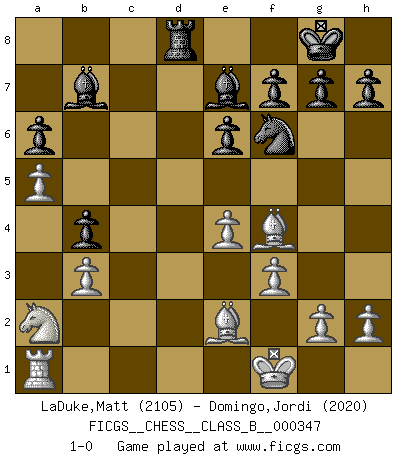 Last move : 1-0 2022 April 24 12:50:6 [Event "FICGS__CHESS__CLASS_B__000347"] [Site "FICGS"] [Date "2021.11.15"] [Round "1"] [White "LaDuke,Matt"] [Black "Domingo,Jordi"] [Result "1-0"] [WhiteElo "2105"] [BlackElo "2020"] 1.Nf3 d5 2.d4 Nf6 3.c4 dxc4 4.e3 e6 5.Bxc4 c5 6.O-O a6 7.dxc5 Qxd1 8.Rxd1 Bxc5 9.Be2 Nbd7 10.Nfd2 b6 11.Nc3 O-O 12.Kf1 Bb7 13.e4 b5 14.Nb3 Bb6 15.f3 Nc5 16.Nxc5 Bxc5 17.Bf4 Rfd8 18.a4 b4 19.Na2 Rac8 20.a5 Be7 21.Rxd8+ Rxd8 22.b3 1-0 This chess game has been lost on time (started : 2021.11.15 9:15:6) Reti Opening Kingside Castling by player White (move 6) Kingside Castling by player Black (move 11) Player White won this chess game. Follow this game move after move (download)When you don't know what to do, wait for your opponent to get an idea - it's sure to be wrong. (Tarrasch) Auf jeden Fall musst du zuerst Rechtsanwalt werden, damit du deine eigenen Interessen und die deiner Familie vertreten kannst. [Brief an seinen Sohn] (José Raúl Capablanca) Yo no le temo a Spassky. Todos saben que yo soy el mejor. Uno no necesita un torneo para probarlo. (Bobby Fischer) La victoire dans une partie d'Echecs appartient la plupart du temps à celui qui voit un peu plus loin que l'adversaire. (Lasker) Luck is when opportunity knocks and you answer. (Anonymous)