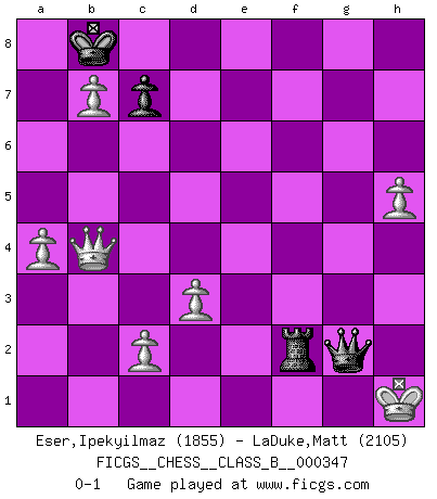Last move : 0-1 2022 July 17 1:16:10 [Event "FICGS__CHESS__CLASS_B__000347"] [Site "FICGS"] [Date "2021.11.15"] [Round "1"] [White "Eser,Ipekyilmaz"] [Black "LaDuke,Matt"] [Result "0-1"] [WhiteElo "1855"] [BlackElo "2105"] 1.g3 e5 2.Bg2 d5 3.Kf1 Nc6 4.b3 Be6 5.Bb2 Qd7 6.d3 O-O-O 7.Nd2 h5 8.h3 e4 9.h4 e3 10.Ndf3 Nh6 11.Nh3 Bg4 12.Bc1 exf2 13.Be3 Nf5 14.Bxf2 Bd6 15.Nf4 Rhe8 16.Kg1 Ne3 17.Qd2 d4 18.a3 f6 19.b4 Nxg2 20.Kxg2 Qf5 21.Raf1 g5 22.hxg5 fxg5 23.Nxh5 Qg6 24.Kg1 Ne5 25.Bxd4 Bxh5 26.Bxe5 Bxf3 27.exf3 Bxe5 28.Kg2 a6 29.a4 Kb8 30.b5 Qd6 31.bxa6 Bxg3 32.axb7 Re5 33.Rh5 Rde8 34.Kh1 g4 35.fxg4 Rxh5+ 36.gxh5 Qd5+ 37.Kg1 Rg8 38.Rf8+ Rxf8 39.Qe3 Qg8 40.Qd2 Qg4 41.Qb4 Bh2+ 42.Kxh2 Rf2+ 43.Kh1 Qg2+ 0-1 Benko's Opening Queenside Castling by player Black (move 6) Player Black won this chess game. Follow this game move after move (download)Fischer sacrificed virtually everything most of us weakies (to use his term) value, respect, and cherish, for the sake of an artful, often beautiful board game, for the ambivalent privilege of being its greatest master. (Paul Kollar) Es ist im Leben wie im Schachspiel. Wir entwerfen einen Plan, dieser bleibt jedoch bedingt durch das, was im Schachspiel dem Gegner, im Leben dem Schicksal zu tun belieben wird. (Arthur Schopenhauer) Un sacrificio se refuta mucho mejor al aceptarlo. (Wilhelm Steinitz) Je menace de comprendre la position. (Anonyme) Over-the-board chess is the favorite of mortals, correspondence chess is the favorite of the gods. (Eduard Dyckhoff)