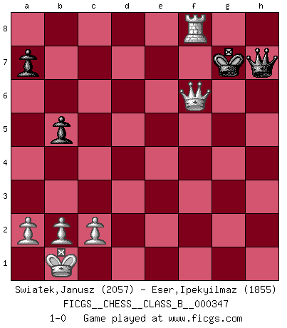Last move : 1-0 2022 August 1 21:48:23 [Event "FICGS__CHESS__CLASS_B__000347"] [Site "FICGS"] [Date "2021.11.15"] [Round "1"] [White "Swiatek,Janusz"] [Black "Eser,Ipekyilmaz"] [Result "1-0"] [WhiteElo "2057"] [BlackElo "1855"] 1.e4 g6 2.d4 Bg7 3.Nc3 Kf8 4.Bc4 e6 5.h4 h6 6.Nge2 b6 7.h5 g5 8.f4 Bb7 9.fxg5 hxg5 10.Be3 d6 11.Qd2 Bf6 12.O-O-O Nd7 13.e5 Be7 14.exd6 cxd6 15.d5 e5 16.Ng3 Nh6 17.Rhf1 Kg8 18.Nce4 f6 19.Bb5 Bc8 20.Nxd6 Bxd6 21.Ne4 Nf7 22.Bxd7 Bxd7 23.Nxf6+ Kg7 24.Bxg5 Bb5 25.Rf3 Rg8 26.Bh4 e4 27.Nxe4 Qxh4 28.Rxf7+ Kxf7 29.Nxd6+ Kf8 30.Nxb5 Rg7 31.Nd4 Qxh5 32.Ne6+ Kg8 33.Nxg7 Kxg7 34.Qd4+ Kg6 35.g4 Qg5+ 36.Kb1 Qf6 37.Qe4+ Kg7 38.d6 Rd8 39.d7 Qf7 40.Qe5+ Qf6 41.Qe3 b5 42.g5 Qf8 43.Qe5+ Kg6 44.Qe4+ Qf5 45.Qe8+ Rxe8 46.dxe8Q+ Kg7 47.Qe7+ Kg6 48.Rd6+ Kh5 49.Rh6+ Kg4 50.Rh1 Qf2 51.g6 Qg2 52.Qe1 Kf5 53.g7 Kf6 54.g8Q Qxg8 55.Rf1+ Kg7 56.Qg3+ Kh8 57.Qh4+ Qh7 58.Rf8+ Kg7 59.Qf6+ 1-0 Robatsch defense Queenside Castling by player White (move 12) Promotion Queen by player White (move 46) Promotion Queen by player White (move 54) 10 pieces endgame at move 54 : White KQRPPP , Black KQPP WHITE : King + 1 Queen 1 Rook 3 Pawns BLACK : King + 1 Queen 2 Pawns Player White won this chess game. Follow this game move after move (download)For me, Chess is life and every game is like a new life. Every Chess player gets to live many lives in one lifetime. (Eduard Gufeld) Das Blackmar-Diemer-Gambit verändert den ganzen Menschen! (Emil Joseph Diemer) El Ajedrez es un juego terrible. Si no dominas el centro, tu oponente tiene una posición mas libre. Si tu tienes el centro, entonces realmente tienes algo de que preocuparte. (Siegbert Tarrasch) Demandez au pauvre Cg1 ce qu'il en pense. Eduard Gufeld à propos de la variante Saemisch de l'Est-Indienne. Life is verb, not a noun. (Charlotte Perkins Gilman)