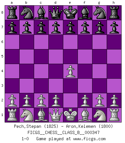 Last move : 1-0 2022 January 1 3:40:31 [Event "FICGS__CHESS__CLASS_B__000347"] [Site "FICGS"] [Date "2021.11.15"] [Round "1"] [White "Pech,Stepan"] [Black "Aron,Kelemen"] [Result "1-0"] [WhiteElo "1825"] [BlackElo "1800"] 1.e4 1-0 This chess game has been lost on time (started : 2021.11.15 9:15:6) King's pawn Opening Player White won this chess game. Follow this game move after move (download)Fischer is completely natural. He plays no roles. He's like a child. Very, very simple. (Zita Rajcsanyi) Man braucht nicht immer den besten Zug zu spielen: Ein Zug muß aktiv, unternehmungslustig, korrekt und schön sein. (David Bronstein) En manos de Fischer's, una diminuta ventaja teórica es tan buena como tener una Reina de ventaja. (Isaac Kashdan) La guerre est enfant de la passion, la passion est enfant du narcissisme et le narcissisme est l'enfant. (...) Une autre partie ? (Thibault de Vassal) It's unlucky to be superstitious. (Dave Enteles)