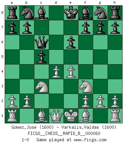Last move : 1-0 2007 September 2 12:52:26 [Event "FICGS__CHESS__RAPID_B__000060"] [Site "FICGS"] [Date "2007.07.25"] [Round "1"] [White "Gomez,Jose"] [Black "Varkalis,Valdas"] [Result "1-0"] [WhiteElo "1600"] [BlackElo "1600"] 1.d4 d5 2.c4 e6 3.Nf3 c5 4.cxd5 Qxd5 5.Nc3 Qc6 6.e4 1-0 This chess game has been lost on time (started : 2007.07.25 0:7:1) Queen's gambit declined Player White won this chess game. Follow this game move after move (download)Chess is no whit inferior to the violin, and we have a large number of professional violinists. (Mikhail Botvinnik) Im Reiche der Wirklichkeit ist man nie so glücklich wie im Reiche der Gedanken. (Arthur Schopenhauer) Todo lo que importa ante el tablero de Ajedrez son buenas jugadas. (Bobby Fischer) Celui qui prend des risques peut perdre, celui qui n'en prend pas perd toujours. (Xavier Tartacover) The hypothalamus is one of the most important parts of the brain, involved in many kinds of motivation, among other functions. The hypothalamus controls the 'Four Fs: Fighting, Fleeing, Feeding and Mating. (Unknown author)