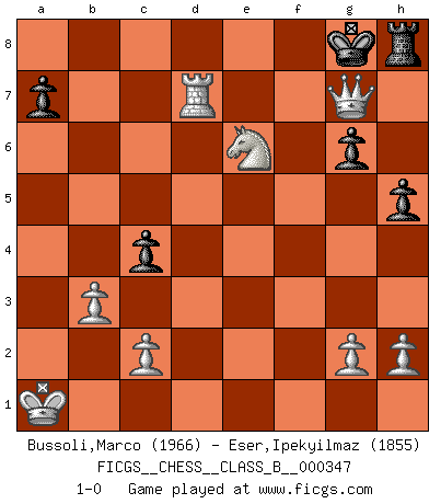Last move : 1-0 2022 February 26 16:49:30 [Event "FICGS__CHESS__CLASS_B__000347"] [Site "FICGS"] [Date "2021.11.15"] [Round "1"] [White "Bussoli,Marco"] [Black "Eser,Ipekyilmaz"] [Result "1-0"] [WhiteElo "1966"] [BlackElo "1855"] 1.d4 g6 2.e4 Bg7 3.Nc3 Kf8 4.Be3 b6 5.Qd2 Bb7 6.f4 d6 7.O-O-O Nd7 8.Be2 h6 9.d5 h5 10.Nf3 c6 11.dxc6 Bxc6 12.e5 Nh6 13.Ng5 Nc5 14.Bc4 Be8 15.Bxc5 bxc5 16.Rhe1 Nf5 17.Nce4 Qb6 18.Bxf7 Bxf7 19.Nxf7 Rb8 20.b3 Kxf7 21.Qd5+ Ke8 22.exd6 Qb4 23.Kb1 Kf8 24.Ng5 Nxd6 25.Ne6+ Ke8 26.Nxg7+ Kd7 27.Rxe7+ Kxe7 28.Qxd6+ Kf7 29.Qe6+ Kf8 30.Rd7 Qxf4 31.Qe7+ Kg8 32.Ne6 Qf1+ 33.Kb2 Rxb3+ 34.axb3 Qa1+ 35.Kxa1 c4 36.Qg7+ 1-0 Modern defense Queenside Castling by player White (move 7) Player White won this chess game. Follow this game move after move (download)Becoming successful at Chess allows you to discover your own personality. That's what I want for the kids I teach. (Saudin Robovic) Kleine Schachspieler machen Mist, und große Schachspieler machen Mist, aber große machen weniger Mist. (Fritz Sämisch) Nada excita más a Grandes Maestros aburridos que una novedad teórica. (Dominic Lawson) Le temps de noter son nom sur la feuille de partie, j'étais déjà en zeitnot ! D'un modeste amateur apparié lors de la première ronde d'un open contre le grand-maître Azmaïparashvili. Humor is by far the most significant activity of the human brain. (Edward De Bono)