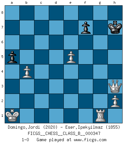 Last move : 1-0 2022 October 2 4:39:2 [Event "FICGS__CHESS__CLASS_B__000347"] [Site "FICGS"] [Date "2021.11.15"] [Round "1"] [White "Domingo,Jordi"] [Black "Eser,Ipekyilmaz"] [Result "1-0"] [WhiteElo "2020"] [BlackElo "1855"] 1.e4 g6 2.d4 Bg7 3.Nc3 Kf8 4.Be3 b6 5.Qd2 Bb7 6.O-O-O d6 7.g4 Nd7 8.Bg2 h6 9.f4 h5 10.g5 e6 11.f5 exf5 12.exf5 Bxg2 13.Qxg2 gxf5 14.Nf3 Rc8 15.Nh4 Ne7 16.Rhf1 c6 17.Bf4 d5 18.Bd6 Kg8 19.Bxe7 Qxe7 20.Nxf5 Qf8 21.Rde1 Re8 22.Nxd5 cxd5 23.Qxd5 Rxe1+ 24.Rxe1 Ne5 25.dxe5 Kh7 26.Qd7 b5 27.Rg1 Rg8 28.Qd1 Bh6 29.Qxh5 Rg6 30.Nxh6 Rxh6 31.gxh6 Qxh6+ 32.Qxh6+ Kxh6 33.b4 Kh7 34.a4 a6 35.c4 bxa4 36.c5 a3 37.c6 a2 38.Kb2 a1Q+ 39.Kxa1 Kh8 40.c7 Kh7 41.c8Q a5 42.Qh3+ 1-0 This chess game has been lost on time (started : 2021.11.15 9:15:6) Robatsch defense Queenside Castling by player White (move 6) 10 pieces endgame at move 35 : White KRPPPP , Black KPPP WHITE : King + 1 Rook 4 Pawns BLACK : King + 3 Pawns Promotion Queen by player Black (move 38) 9 pieces endgame at move 39 : White KRPPPP , Black KPP WHITE : King + 1 Rook 4 Pawns BLACK : King + 2 Pawns Promotion Queen by player White (move 41) Player White won this chess game. Follow this game move after move (download)The sign of a great Master is his ability to win a won game quickly and painlessly. (Irving Chernev) Ein guter Spieler hat immer Glück. (José Raúl Capablanca) Tu sabes, camarada Pachman, no disfruto el ser un Ministro, preferería jugar al Ajedrez como tu. (Che Guevara) Toute estimation doit être constamment réévaluée. (Jacob Estrin) Drag your thoughts away from your troubles... by the ears, by the heels, or any other way you can manage it. (Mark Twain)