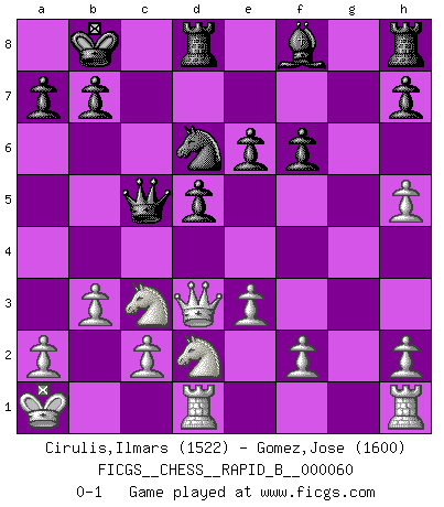 Last move : 0-1 2007 October 5 17:30:0 [Event "FICGS__CHESS__RAPID_B__000060"] [Site "FICGS"] [Date "2007.07.25"] [Round "1"] [White "Cirulis,Ilmars"] [Black "Gomez,Jose"] [Result "0-1"] [WhiteElo "1522"] [BlackElo "1600"] 1.d4 Nf6 2.Bf4 d5 3.Nc3 Bf5 4.e3 e6 5.Bd3 Bxd3 6.Qxd3 Nbd7 7.Nf3 Nh5 8.Bg5 f6 9.Bh4 g5 10.g4 gxh4 11.gxh5 Qe7 12.O-O-O Nb6 13.Nxh4 Nc4 14.Kb1 Qb4 15.b3 O-O-O 16.Nf3 Kb8 17.Ka1 Nd6 18.Nd2 c5 19.dxc5 Qxc5 0-1 This chess game has been lost on time (started : 2007.07.25 0:7:1) Queen's pawn game Queenside Castling by player White (move 12) Queenside Castling by player Black (move 15) Player Black won this chess game. Follow this game move after move (download)Some part of a mistake is always correct. (Savielly Tartakover) Schach sollte überall auf der Welt Schulfach werden. Es fördert die geistige Auseinandersetzung. Es lehrt die Demut in der Niederlage. (Garry Kasparov) Cuando estes solo, cuando te sientas un extraño en el mundo, juega al Ajedrez. Esto levantará tu espiritu y será tu consejero de guerra. (Aristóteles) C'est la seule position que je connaisse où les deux camps sont mals. Propos prêtés à V. Anand. History is the quarrels of popes and kings, with wars or pestilences in every page; the men all so good for nothing, and hardly any women at all. (Jane Austen)