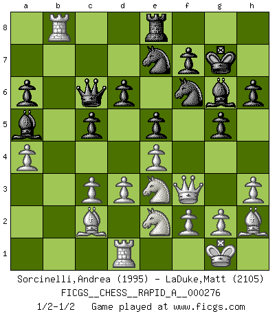 Last move : 1/2-1/2 2021 December 11 21:26:33 [Event "FICGS__CHESS__RAPID_A__000276"] [Site "FICGS"] [Date "2021.11.16"] [Round "1"] [White "Sorcinelli,Andrea"] [Black "LaDuke,Matt"] [Result "1/2-1/2"] [WhiteElo "1995"] [BlackElo "2105"] 1.e4 e5 2.Nf3 Nc6 3.Bb5 Nf6 4.d3 Bc5 5.c3 O-O 6.O-O Re8 7.Bg5 a6 8.Ba4 h6 9.Bh4 g5 10.Bg3 b5 11.Bb3 d6 12.Nbd2 Bb6 13.Re1 Ne7 14.a4 Bg4 15.h3 Bh5 16.Bh2 c5 17.Nf1 Qc7 18.Ng3 Bg6 19.Nd2 Qb7 20.Ndf1 Kg7 21.Qf3 Qc7 22.Red1 Rab8 23.Bc2 b4 24.Ne3 bxc3 25.bxc3 Ba5 26.Ne2 Qb7 27.Rab1 Qc6 28.Rxb8 1/2-1/2 Ruy Lopez : Berlin defense Kingside Castling by player Black (move 5) Kingside Castling by player White (move 6) This chess game ended in a draw. Follow this game move after move (download)Many Chess players were surprised when after the game, Fischer quietly explained: 'I had already analyzed this possibility' in a position which I thought was not possible to foresee from the opening. (Mikhail Tal) Die größte Kunst beim Schach besteht darin dem Gegner nicht zu zeigen was er tun kann. (Garry Kasparov) El Ajedrez es 99 por ciento táctica. (Teichmann) Le jeu d'échecs est comme rejeté hors du temps. (Antoine de Saint-Exupéry) Either move or be moved. (Ezra Pound)