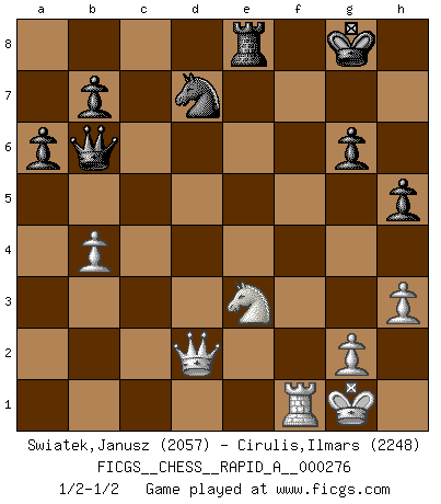 Last move : 1/2-1/2 2021 December 15 14:42:20 [Event "FICGS__CHESS__RAPID_A__000276"] [Site "FICGS"] [Date "2021.11.16"] [Round "1"] [White "Swiatek,Janusz"] [Black "Cirulis,Ilmars"] [Result "1/2-1/2"] [WhiteElo "2057"] [BlackElo "2248"] 1.e4 c5 2.Nf3 d6 3.d4 cxd4 4.Nxd4 Nf6 5.Nc3 a6 6.f3 e5 7.Nb3 Be6 8.Be3 h5 9.Be2 Nbd7 10.Nd5 Bxd5 11.exd5 g6 12.Qd2 Qc7 13.O-O Nb6 14.c4 Nxc4 15.Bxc4 Qxc4 16.Rfd1 Be7 17.Na5 Qb5 18.a4 Qd7 19.Nc4 Rb8 20.Nb6 Qf5 21.a5 O-O 22.Ra4 Rfe8 23.h3 Nd7 24.Nc4 Bf8 25.Rf1 Rbc8 26.Rb4 Rc7 27.f4 e4 28.Bd4 Qxd5 29.Ne3 Qxa5 30.Bc3 Rxc3 31.bxc3 d5 32.f5 Bxb4 33.cxb4 Qb5 34.fxg6 fxg6 35.Nxd5 e3 36.Nxe3 Qb6 1/2-1/2 Sicilian : Najdorf Kingside Castling by player White (move 13) Kingside Castling by player Black (move 21) This chess game ended in a draw. Follow this game move after move (download)We must make sure that Chess will not be like a dead language, very interesting, but for a very small group. (Sytze Faber) Schach ist mein Leben, meine Leidenschaft, was ich gelernt habe und seit meinem 14. Lebensjahr profimässig praktiziere. Darauf zu verzichten, würde mir sehr schwer fallen. (Viktor Kortschnoi) Me dio la sensación de como si yo estuviera jugando en contra del mismo Ajedrez. - al estar jugando en contra de Robert Fischer (Walter Shipman) Des points faibles ou des trous dans la position de l'adversaire doivent être occupés par des pièces et non pas par des pions. (Siegbert Tarrasch) As a goal marker shodan is important. As a destination it is a poor place to stop. (Thomas Tamayo)