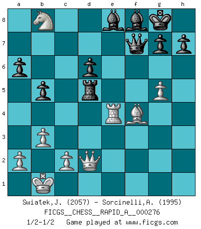 Last move : 1/2-1/2 2021 December 1 18:57:15 [Event "FICGS__CHESS__RAPID_A__000276"] [Site "FICGS"] [Date "2021.11.16"] [Round "1"] [White "Swiatek,Janusz"] [Black "Sorcinelli,Andrea"] [Result "1/2-1/2"] [WhiteElo "2057"] [BlackElo "1995"] 1.e4 c5 2.Nf3 d6 3.d4 cxd4 4.Nxd4 Nf6 5.Nc3 a6 6.f3 e5 7.Nb3 Be7 8.Be3 Be6 9.Qd2 O-O 10.O-O-O Nbd7 11.g4 b5 12.g5 Nh5 13.Kb1 Nb6 14.Na5 Qc7 15.Nd5 Nxd5 16.exd5 Bf5 17.h4 Ng3 18.Rg1 Nxf1 19.Rgxf1 f6 20.Nc6 fxg5 21.hxg5 Bg6 22.f4 exf4 23.Bxf4 Qd7 24.Rde1 Rf7 25.b3 Bf8 26.Re6 Rf5 27.Rfe1 Re8 28.Rxe8 Bxe8 29.Nb8 Qf7 30.Re4 Rxd5 1/2-1/2 Sicilian : Najdorf Kingside Castling by player Black (move 9) Queenside Castling by player White (move 10) This chess game ended in a draw. Follow this game move after move (download)Chess is the art of analysis. (Mikhail Botvinnik) Ein Buch ist ein Spiegel; wenn ein Affe hineinsieht, so kann kein Apostel heraus gucken. (Georg Christoph Lichtenberg) La captura del Rey enemigo es la finalidad pero no el primer objetivo de la partida. (William Steinitz) Karpov est une pièce de musée. (Garry Kasparov) Those who make the worst use of their time are the first to complain of its brevity. (Jean de la Bruyere)