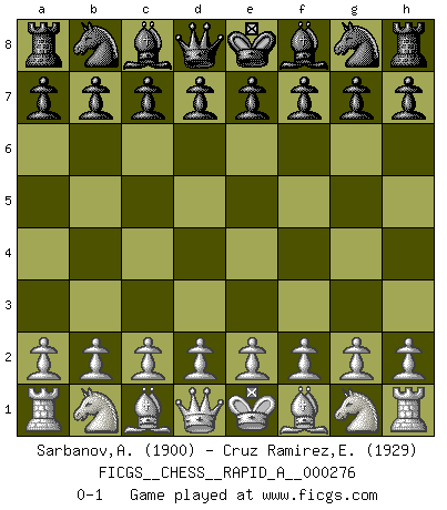 Last move : 0-1 2021 December 16 12:33:55 [Event "FICGS__CHESS__RAPID_A__000276"] [Site "FICGS"] [Date "2021.11.16"] [Round "1"] [White "Sarbanov,Alisher"] [Black "Cruz Ramirez,Eliecer"] [Result "0-1"] [WhiteElo "1900"] [BlackElo "1929"] 0-1 This chess game has been lost on time (started : 2021.11.16 5:12:37) Player Black won this chess game. Follow this game move after move (download)You must take your opponent into a deep dark forest where 2+2=5, and the path leading out is only wide enough for one. (Mikhail Tal) Auf Remis zu spielen ist gewissermaßen ein Verbrechen gegen das Schachspiel. (Mikhail Nekhemyevich Tal) a manera como él juega al Ajedrez, demuestra la completa naturaleza de un hombre. (Stanley Ellin) La vie et les Echecs sont tous les deux une lutte constante. (Lasker) You can think I'm wrong, but that's no reason to quit thinking. (Gregory House, House M.D.)