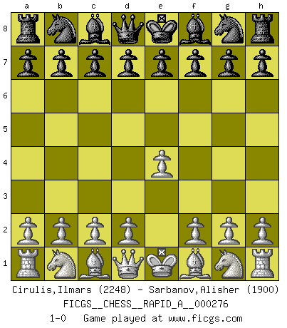 Last move : 1-0 2021 December 16 12:33:55 [Event "FICGS__CHESS__RAPID_A__000276"] [Site "FICGS"] [Date "2021.11.16"] [Round "1"] [White "Cirulis,Ilmars"] [Black "Sarbanov,Alisher"] [Result "1-0"] [WhiteElo "2248"] [BlackElo "1900"] 1.e4 1-0 This chess game has been lost on time (started : 2021.11.16 5:12:37) King's pawn Opening Player White won this chess game. Follow this game move after move (download)Via the squares on the chessboard, the Indians explain the movement of time and the age, the higher influences which control the world and the ties which link Chess with the human soul. (Al-Masudi) Schach ist die gewalttätigste aller Sportarten. (Garry Kasparov) Si el Ajedrez es una ciencia, es la mas inexacta. Si el Ajedrez es un arte, es demasiado inexacto para ser visto como tal. Si el Ajedrez es un deporte, es demasiado esotérico. Si el Ajedrez es un juego, es demasiado exigente para ser solo un juego. Si el Ajedrez es una aventura, es una muy demandante. Si el Ajedrez es una pasión, es una muy gratificante. Si el Ajedrez es la vida, es una muy triste. (Anónimo) Donnez-moi un Cavalier en 6e et je gagnerais toutes mes parties. (Steinitz) Hold em is to stud what chess is to checkers. (Johnny Moss)