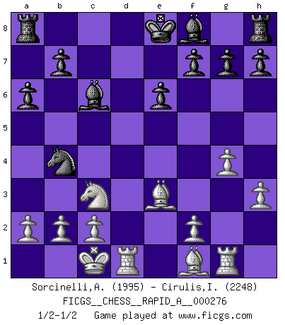 Last move : 1/2-1/2 2021 November 16 17:36:32 [Event "FICGS__CHESS__RAPID_A__000276"] [Site "FICGS"] [Date "2021.11.16"] [Round "1"] [White "Sorcinelli,Andrea"] [Black "Cirulis,Ilmars"] [Result "1/2-1/2"] [WhiteElo "1995"] [BlackElo "2248"] 1.e4 c5 2.Nf3 d6 3.d4 cxd4 4.Nxd4 Nf6 5.Nc3 a6 6.h3 e6 7.g4 d5 8.Nde2 Nxe4 9.Nxe4 dxe4 10.Qxd8+ Kxd8 11.Be3 Nc6 12.O-O-O Ke8 13.Nc3 Bd7 14.Nxe4 Nb4 15.Nc3 Bc6 16.Rg1 1/2-1/2 Sicilian : Najdorf, Adams attack Queenside Castling by player White (move 12) This chess game ended in a draw. Follow this game move after move (download)The laws of Chess do not permit a free choice: you have to move whether you like it or not. (Emanuel Lasker) Schach ist Krieg, im Schach geht es um testosterongesteuerte Urschreie. (Garry Kasparov) Yo he agregado estos principios a la ley: pongan los Caballos en acción antes de que los dos Alfiles sean desarrollados. (Emanuel Lasker) Soyez une menace à chaque fois que vous vous asseyez pour jouer. (Ken Smith) Wisdom doesn't necessarily come with age. Sometimes age just shows up all by itself. (Tom Watson)
