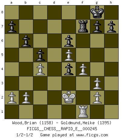 Last move : 1/2-1/2 2022 February 9 17:5:14 [Event "FICGS__CHESS__RAPID_E__000245"] [Site "FICGS"] [Date "2021.11.16"] [Round "1"] [White "Wood,Brian"] [Black "Goldmund,Heike"] [Result "1/2-1/2"] [WhiteElo "1158"] [BlackElo "1395"] 1.e4 d5 2.d4 dxe4 3.Bc4 Nf6 4.c3 Bf5 5.Bg5 e6 6.Ne2 Nbd7 7.Qb3 Be7 8.O-O Nb6 9.Nd2 Nxc4 10.Nxc4 b6 11.Ne5 O-O 12.Rfd1 Nd5 13.Bxe7 Qxe7 14.Ng3 Qf6 15.Nxf5 Qxf5 16.c4 Nf4 17.Qe3 Qg5 18.Qg3 Qxg3 19.hxg3 Ne2+ 20.Kf1 f6 21.Kxe2 fxe5 22.dxe5 Rf5 23.Rd7 c5 24.Rad1 Raf8 25.Rf1 R5f7 26.Rxf7 Rxf7 27.f4 1/2-1/2 Scandinavian (centre counter) defense Kingside Castling by player White (move 8) Kingside Castling by player Black (move 11) This chess game ended in a draw. Follow this game move after move (download)The combination player thinks forward; he starts from the given position, and tries the forceful moves in his mind. (Emanuel Lasker) Der Bart als Geschlechtszeichen mitten im Gesicht ist obszön. Daher gefällt er den Weibern. [Zugegeben, kein Schachzitat, aber unglaublich originell] (Arthur Schopenhauer) El Ajedrez es una hermosa aventura. (Bent Larsen) Tous ces prétendus hommes politiques sont les pions, les Cavaliers, les Tours ou les Fous d'une partie d'échecs qui se jouera tant qu'un hasard ne renversera pas l'échiquier. (Honoré de Balzac) Two beer, or not two beer. (Unknown)