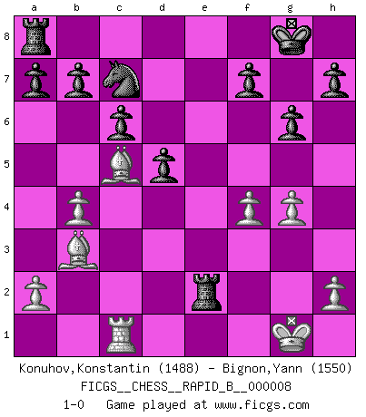 Last move : 1-0 2006 August 30 18:58:53 [Event "FICGS__CHESS__RAPID_B__000008"] [Site "FICGS"] [Date "2006.06.24"] [Round "1"] [White "Konuhov,Konstantin"] [Black "Bignon,Yann"] [Result "1-0"] [WhiteElo "1488"] [BlackElo "1550"] 1.e4 d6 2.f4 Nf6 3.d4 g6 4.Nf3 Nxe4 5.Bb5 c6 6.Ba4 Qa5+ 7.c3 Bg7 8.O-O Bg4 9.d5 Bxf3 10.Rxf3 O-O 11.Re3 Qxd5 12.Nd2 Nxd2 13.Qxd2 Qxd2 14.Bxd2 e6 15.Rc1 Na6 16.b4 Nc7 17.c4 Bd4 18.g4 Bxe3+ 19.Bxe3 d5 20.cxd5 exd5 21.Bc5 Rfe8 22.Bc2 Re2 23.Bb3 1-0 King's pawn Opening Kingside Castling by player White (move 8) Kingside Castling by player Black (move 10) Player White won this chess game. Follow this game move after move (download)Chess is the gymnasium of the mind. (Blaise Pascal) Gott hat gewollt, dass ich Champion werde. (Surab Azmajparaschvili) Botvinnik trataba de restarle el misterio al Ajedrez, siempre relacionandolo a situaciones de la vida ordinaria. El gustaba de llamar al Ajedrez un típico problema inexacto similar a aquellos de los cuales la gente siempre tiene que enfrentarse en la vida cotidiana. (Garry Kasparov) Des idées, des idées, j'en ai cent, j'en ai mille. Des bonnes, des mauvaises, applicables, irréalisables... Il suffit de faire le tri ! (Roos) Life is pain my dear and anyone who says otherwise is selling something. (Princess Bride)