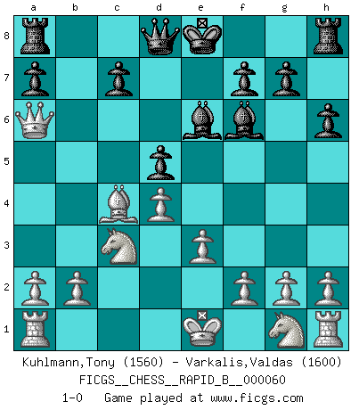 Last move : 1-0 2007 September 8 13:31:23 [Event "FICGS__CHESS__RAPID_B__000060"] [Site "FICGS"] [Date "2007.07.25"] [Round "1"] [White "Kuhlmann,Tony"] [Black "Varkalis,Valdas"] [Result "1-0"] [WhiteElo "1560"] [BlackElo "1600"] 1.d4 d5 2.c4 e6 3.Nc3 Nf6 4.cxd5 exd5 5.Bg5 Be7 6.e3 h6 7.Bh4 Nc6 8.Bxf6 Bxf6 9.Qb3 Be6 10.Qxb7 Na5 11.Qa6 Nc4 12.Bxc4 1-0 This chess game has been lost on time (started : 2007.07.25 0:7:1) QGD : Exchange, positional line Player White won this chess game. Follow this game move after move (download)By this measure (on the gap between Fischer & his contemporaries), I consider him the greatest world champion. (Garry Kasparov) Das Schachspiel ist ein See, in welchem eine Mücke baden und ein Elefant ertrinken kann. (Emanuel Lasker) Solo los afeminados hacen el Enroque. (Rob Sillars) Les échecs sont un jeu par leur forme, un art par leur essence et une science par sa difficulté d'acquisition. Ils peuvent vous procurer autant de plaisir qu'un bon livre ou une belle musique, mais vous n'aurez une réelle joie que si vous arrivez à bien jouer. (Tigran Petrosian) Art is not a thing, it is a way. (Elbert Hubbard)