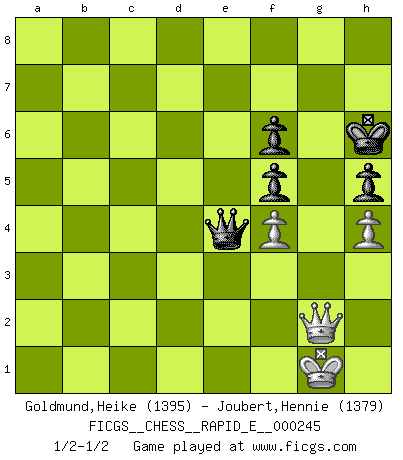 Last move : 1/2-1/2 2022 March 8 12:44:25 [Event "FICGS__CHESS__RAPID_E__000245"] [Site "FICGS"] [Date "2021.11.16"] [Round "1"] [White "Goldmund,Heike"] [Black "Joubert,Hennie"] [Result "1/2-1/2"] [WhiteElo "1395"] [BlackElo "1379"] 1.e4 c5 2.b4 e6 3.a3 cxb4 4.d4 bxa3 5.Nxa3 Bb4+ 6.Bd2 Bxd2+ 7.Qxd2 Nf6 8.e5 Nd5 9.Nf3 a6 10.Bc4 Nb6 11.Be2 Nc6 12.c3 O-O 13.O-O d6 14.Nc4 dxe5 15.Nfxe5 Nxe5 16.Nxe5 Nd5 17.Bf3 Rb8 18.Rfb1 f6 19.c4 Ne7 20.Ng4 b6 21.Qf4 Bb7 22.Bxb7 Rxb7 23.Qf3 Rb8 24.Rxa6 h5 25.Ne3 Qxd4 26.R6a1 g6 27.Rd1 Qe5 28.Ra7 Nf5 29.Nxf5 exf5 30.g3 Rf7 31.Ra8 Rxa8 32.Qxa8+ Kg7 33.Qc6 Rc7 34.Qxb6 Rxc4 35.Qb7+ Rc7 36.Rd7+ Rxd7 37.Qxd7+ Kh6 38.Qd2+ g5 39.h4 Kg6 40.f4 gxf4 41.gxf4 Qe4 42.Qg2+ Kh7 43.Qb2 Kg6 44.Qg2+ Kh6 1/2-1/2 Sicilian : wing gambit Kingside Castling by player Black (move 12) Kingside Castling by player White (move 13) 10 pieces endgame at move 40 : White KQPP , Black KQPPPP WHITE : King + 1 Queen 2 Pawns BLACK : King + 1 Queen 4 Pawns 9 pieces endgame at move 41 : White KQPP , Black KQPPP WHITE : King + 1 Queen 2 Pawns BLACK : King + 1 Queen 3 Pawns This chess game ended in a draw. Follow this game move after move (download)Good offense and good defense both begin with good development. (Bruce A. Moon) Herr Iljumschinow ist ein etwas merkwürdiger Geschäftsmann: Er arbeitet zusammen mit Leuten wie Muammar al-Gaddafi; früher ist das Saddam Hussein gewesen. (Joel Lautier) Todo se encuentra en un estado de flujo y esto incluye al mundo del Ajedrez. (Mikhail Botvinnik) Roi des jeux et jeu des rois, les échecs portent en eux un sentiment d'infini. Ils donnent à celui qui s'est efforcé d'en approfondir les arcanes l'impression de n'être pas à la mesure de l'homme; en fait, ils constituent un résumé de l'univers, un microcosme, et figurent cette grande échelle qui, dans les plans de la lumière descend jusqu'à la matière, qui des abîmes insondables remonte jusqu'en l'infini de Dieu. (Pyrame) It is a good thing for an uneducated man to read books of quotations. (Winston Churchill)
