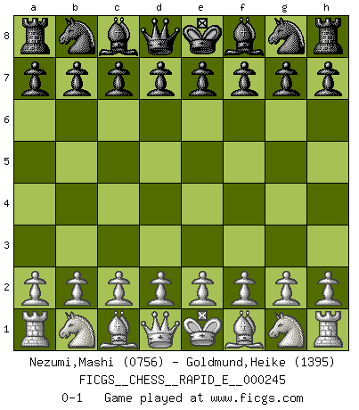 Last move : 0-1 2021 December 17 1:58:7 [Event "FICGS__CHESS__RAPID_E__000245"] [Site "FICGS"] [Date "2021.11.16"] [Round "1"] [White "Nezumi,Mashi"] [Black "Goldmund,Heike"] [Result "0-1"] [WhiteElo "0756"] [BlackElo "1395"] 0-1 This chess game has been lost on time (started : 2021.11.16 21:57:12) Player Black won this chess game. Follow this game move after move (download)What is the object of playing a gambit opening?... To acquire a reputation of being a dashing player at the cost of losing a game. (Siegbert Tarrasch) Schach ist gnadenlos. Du mußt bereit sein zu töten. (Nigel Short) Un Peón pasado aumenta su poder a medida de que el número de piezas en el tablero disminuye. (Capablanca) Les pièces de l'échiquier étaient impitoyables. Elles le retenaient, elles l'absorbaient. Il y avait de l'horreur en cela, mais aussi une harmonie unique. Car, qu'y a-t-il dans le monde, à part les échecs ? (V. Nabokov) Secret operations are essential in war; upon them the army relies to make its every move. (Sun Tzu)