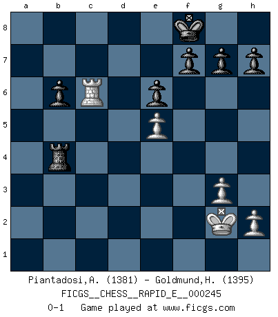 Last move : 0-1 2022 February 5 0:29:14 [Event "FICGS__CHESS__RAPID_E__000245"] [Site "FICGS"] [Date "2021.11.16"] [Round "1"] [White "Piantadosi,Angelo"] [Black "Goldmund,Heike"] [Result "0-1"] [WhiteElo "1381"] [BlackElo "1395"] 1.e4 d5 2.exd5 Qxd5 3.Nc3 Qa5 4.d4 Nf6 5.Bd2 c6 6.Ne4 Qc7 7.Nf3 Nxe4 8.Be3 Bg4 9.Be2 e6 10.Nd2 Bxe2 11.Qxe2 Nxd2 12.Qxd2 Bd6 13.g3 Nd7 14.O-O O-O 15.f4 Nb6 16.b3 Nd5 17.Bf2 Bb4 18.Qd3 Rfd8 19.c4 Ne7 20.a3 Bc5 21.Qe4 Bb6 22.Rad1 Nf5 23.c5 Ba5 24.b4 Bxb4 25.axb4 b6 26.Qe5 Qxe5 27.fxe5 Rd5 28.Kg2 Rad8 29.Rfe1 Nxd4 30.Bxd4 Rxd4 31.Rxd4 Rxd4 32.cxb6 axb6 33.Rc1 Kf8 34.Rxc6 Rxb4 0-1 Scandinavian (centre counter) defense Kingside Castling by player White (move 14) Kingside Castling by player Black (move 14) Player Black won this chess game. Follow this game move after move (download)Different people feel differently about resigning. (Bobby Fischer) Wie, soll nun auch die Opposition abgeschafft werden? Ja, es tut mir leid, Ihnen diesen Schmerz nicht ersparen zu können. (Aaron Nimzowitsch) Aún el Rey más flojo huye despavorido ante la amenaza de un Jaque doble. (Aaron Nimzowitsch) Le moment que je préfère le plus dans une rencontre, c'est celui où je sens que la personnalité de l'adversaire se brise. (Robert Fischer) Now you put water in a cup, it becomes the cup; You put water into a bottle it becomes the bottle; You put it in a teapot it becomes the teapot. Water can flow or it can crash. Be water, my friend. (Bruce Lee)