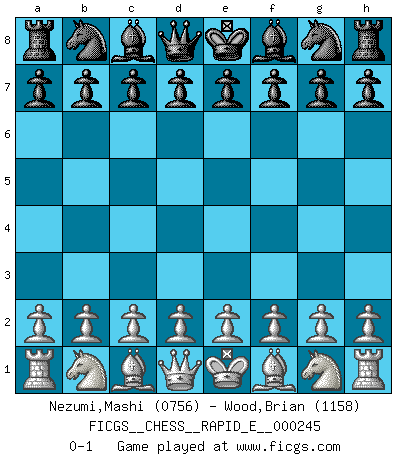 Last move : 0-1 2021 December 17 1:58:7 [Event "FICGS__CHESS__RAPID_E__000245"] [Site "FICGS"] [Date "2021.11.16"] [Round "1"] [White "Nezumi,Mashi"] [Black "Wood,Brian"] [Result "0-1"] [WhiteElo "0756"] [BlackElo "1158"] 0-1 This chess game has been lost on time (started : 2021.11.16 21:57:12) Player Black won this chess game. Follow this game move after move (download)Chess is not like life... it has rules ! (Mark Pasternak) Man wirke der falschen Auffassung entgegen, als ob jeder Zug Unmittelbares zu leisten habe; auch Werte- und Ruhezüge haben ihre Existenzberechtigung. (Aaron Nimzowitsch) No puedes jugar al Ajedrez si eres de corazón noble. (Proverbio Francés) Un footballeur joue avec ses pieds, parfois avec sa tête. Un joueur d'échecs ne joue qu'avec sa tête. Et quand il ne joue plus, il meurt. (Jacob Murray) What doesn't kill us makes us stronger. (Friedrich Nietzsche)