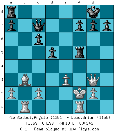 Last move : 0-1 2022 January 30 1:8:48 [Event "FICGS__CHESS__RAPID_E__000245"] [Site "FICGS"] [Date "2021.11.16"] [Round "1"] [White "Piantadosi,Angelo"] [Black "Wood,Brian"] [Result "0-1"] [WhiteElo "1381"] [BlackElo "1158"] 1.e4 c5 2.Nf3 e6 3.d4 d5 4.exd5 exd5 5.Be3 cxd4 6.Nxd4 Nf6 7.Nc3 Nc6 8.Bb5 Bd7 9.O-O Bd6 10.Nxc6 bxc6 11.Ba4 O-O 12.Ne2 Re8 13.Nd4 Qc7 14.Bb3 Bxh2+ 15.Kh1 Ng4 16.Qf3 Be5 17.Nf5 Bxf5 18.Qxf5 Nxe3 19.fxe3 Bxb2 20.Rab1 Re5 21.Qf4 Rh5+ 22.Kg1 Be5 23.Qg4 Bh2+ 24.Kf2 Bg3+ 25.Qxg3 Rf5+ 0-1 Sicilian : Marshall variation Kingside Castling by player White (move 9) Kingside Castling by player Black (move 11) Player Black won this chess game. Follow this game move after move (download)No Chess Grandmaster is normal; they only differ in the extent of their madness. (Viktor Korchnoi) Den Ruhm habe ich schon, jetzt brauche ich noch das Geld. (Wilhelm Steinitz) Hasta este punto, las blancas han seguido un análisis bien conocido. Pero ahora el hace un error fatal: empieza a usar su propia cabeza. (Siegbert Tarrasch) La vérité est comme le meilleur coup aux échecs : elle existe, mais il faut la chercher. (Arturo Perez-Reverte) Plans are ideas that never come to fruition. (Daniel Parmet)