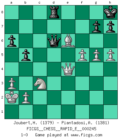 Last move : 1-0 2022 February 18 1:22:29 [Event "FICGS__CHESS__RAPID_E__000245"] [Site "FICGS"] [Date "2021.11.16"] [Round "1"] [White "Joubert,Hennie"] [Black "Piantadosi,Angelo"] [Result "1-0"] [WhiteElo "1379"] [BlackElo "1381"] 1.e4 c5 2.Nf3 d6 3.d4 cxd4 4.Nxd4 Nf6 5.Nc3 a6 6.Be3 Nc6 7.Qd2 e6 8.Be2 Be7 9.g4 O-O 10.f4 Nxd4 11.Bxd4 d5 12.e5 Nd7 13.O-O-O Bc5 14.Bxc5 Nxc5 15.Bf3 b5 16.a3 Bb7 17.h4 Rc8 18.Kb1 f6 19.exf6 Rxf6 20.g5 Rf8 21.Bg4 Rc6 22.h5 Rd6 23.Rhe1 d4 24.Ne2 Ne4 25.Qb4 Nf2 26.Rg1 Nxd1 27.Rxd1 d3 28.cxd3 Rxd3 29.Bxe6+ Kh8 30.Rc1 Be4 31.Qxe4 Rd1 32.Rxd1 Qxd1+ 33.Ka2 Rd8 34.Nc3 Qd6 35.f5 1-0 Sicilian : Najdorf, Byrne (English) attack Kingside Castling by player Black (move 9) Queenside Castling by player White (move 13) Player White won this chess game. Follow this game move after move (download)Even the laziest King flees wildly in the face of a double check ! (Aaron Nimzowitsch) Was ist der Unterschied zwischen einem Strassenarbeiter und einem Schachspieler? --Der Schachspieler bewegt sich ab und zu. (Anonymous) Todo se encuentra en un estado de flujo y esto incluye al mundo del Ajedrez. (Mikhail Botvinnik) Soyez une menace à chaque fois que vous vous asseyez pour jouer. (Ken Smith) Life is like a ten-speed bicycle: most of us have gears we never use. (Charles M. Schulz)