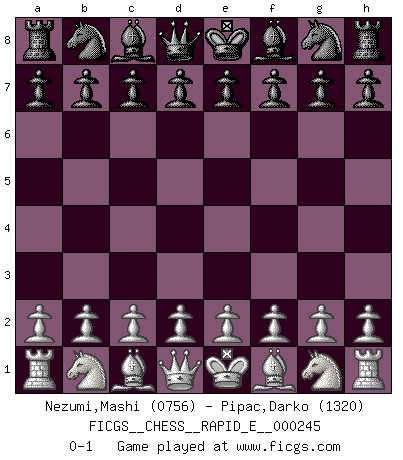 Last move : 0-1 2021 December 17 1:58:7 [Event "FICGS__CHESS__RAPID_E__000245"] [Site "FICGS"] [Date "2021.11.16"] [Round "1"] [White "Nezumi,Mashi"] [Black "Pipac,Darko"] [Result "0-1"] [WhiteElo "0756"] [BlackElo "1320"] 0-1 This chess game has been lost on time (started : 2021.11.16 21:57:12) Player Black won this chess game. Follow this game move after move (download)Chess is ruthless: you've got to be prepared to kill people. (Nigel Short) Frage des Reporters: -Welche besonderen Umstände rechtfertigen das Anhalten der Uhren während einer Turnierpartie? Antwort: -Einen Fotographen zu strangulieren. (Siegbert Tarrasch) Un Peón pasado aumenta su poder a medida de que el número de piezas en el tablero disminuye. (Capablanca) Le succès, c'est être capable d'aller d'échec en échec sans perdre son enthousiasme. (Winston Churchill) Wisdom is the reward you get for a lifetime of listening when you'd have preferred to talk. (Doug Larson)