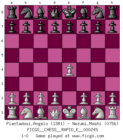 Last move : 1-0 2021 December 17 1:58:7 [Event "FICGS__CHESS__RAPID_E__000245"] [Site "FICGS"] [Date "2021.11.16"] [Round "1"] [White "Piantadosi,Angelo"] [Black "Nezumi,Mashi"] [Result "1-0"] [WhiteElo "1381"] [BlackElo "0756"] 1.e4 1-0 This chess game has been lost on time (started : 2021.11.16 21:57:12) King's pawn Opening Player White won this chess game. Follow this game move after move (download)We like to think. (Gary Kasparov) Ich tröste mich mit dem Vergnügen, daß Schachfans, Zuschauer und Leser glücklich sind, wenn ein Großmeister etwas riskiert, statt nur Klötzchen zu schieben. (Mikhail Nekhemyevich Tal) Aquel que ve no otra dirección en el juego que la de dar Jaque Mate a su oponente, nunca será un buen jugador de Ajedrez. (Euwe) C'est une question de caractère, Beaucoup de gens perdent leur motivation très vite. D'autres, ils sont rares, peuvent la conserver très longtemps. J'aime les échecs, encore aujourd'hui je suis heureux d'analyser des parties. J'aime toujours gagner, je déteste encore perdre. Bien jouer est important pour mon intégrité intellectuelle et morale. Et puis les échecs vivent en ce moment une période historique grâce à Internet. Ils se développent dans les systèmes éducatifs à travers le monde. Ils sortent de leur ghetto, et c'est mon rôle de mener à bien cette révolution. (Gary Kasparov) It's unlucky to be superstitious. (Dave Enteles)